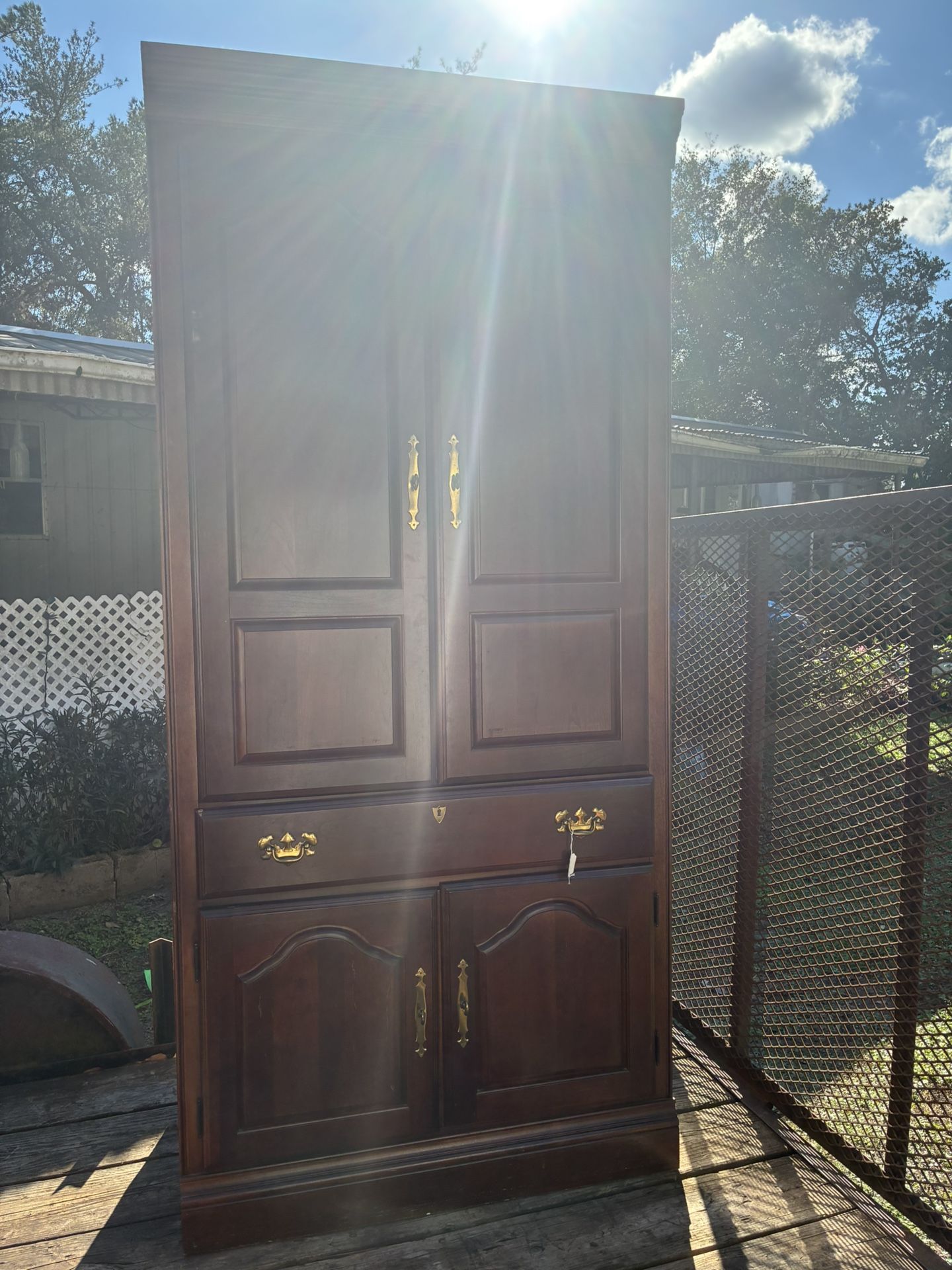 Three piece entertainment center. Sides come with lights and glass shelves not included in photo. Came from estate sale. Still in very good condition.