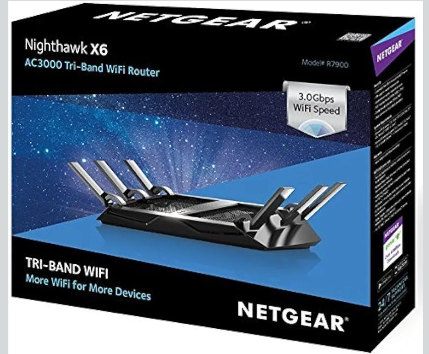 Fast NETGEAR Nighthawk X6 AC3000 Tri-Band WiFi router. Model R7900. Has 3.0Gbps WiFi speed and Gigabit Ethernet ports. Compatible with Amazon Echo/Alexa. Good for lots of devices.