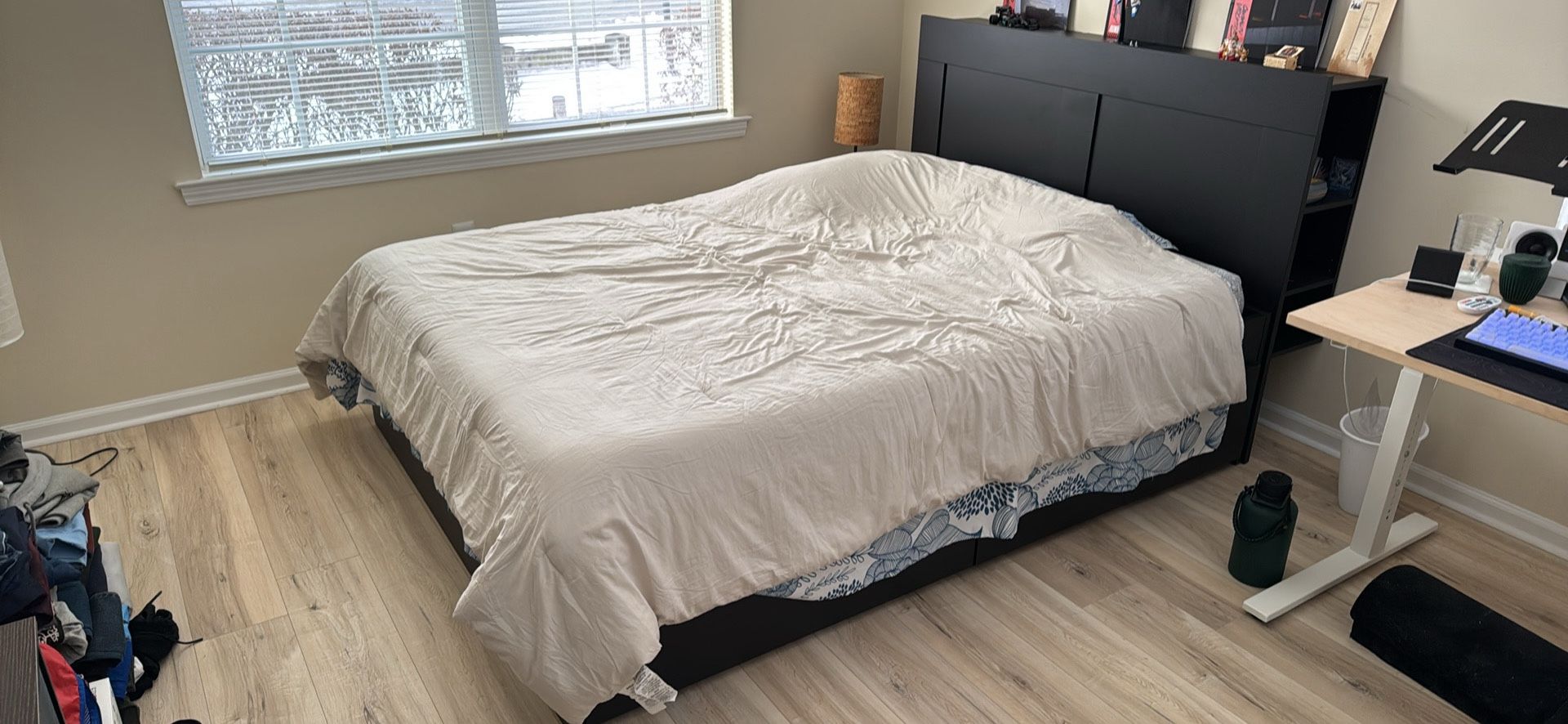Bedframe and mattress ONLY. Ikea BRIMNES Bed frame with storage & headboard, black/Luröy, Queen - $350 Mattress Firm Memory foam queen size mattress - $300