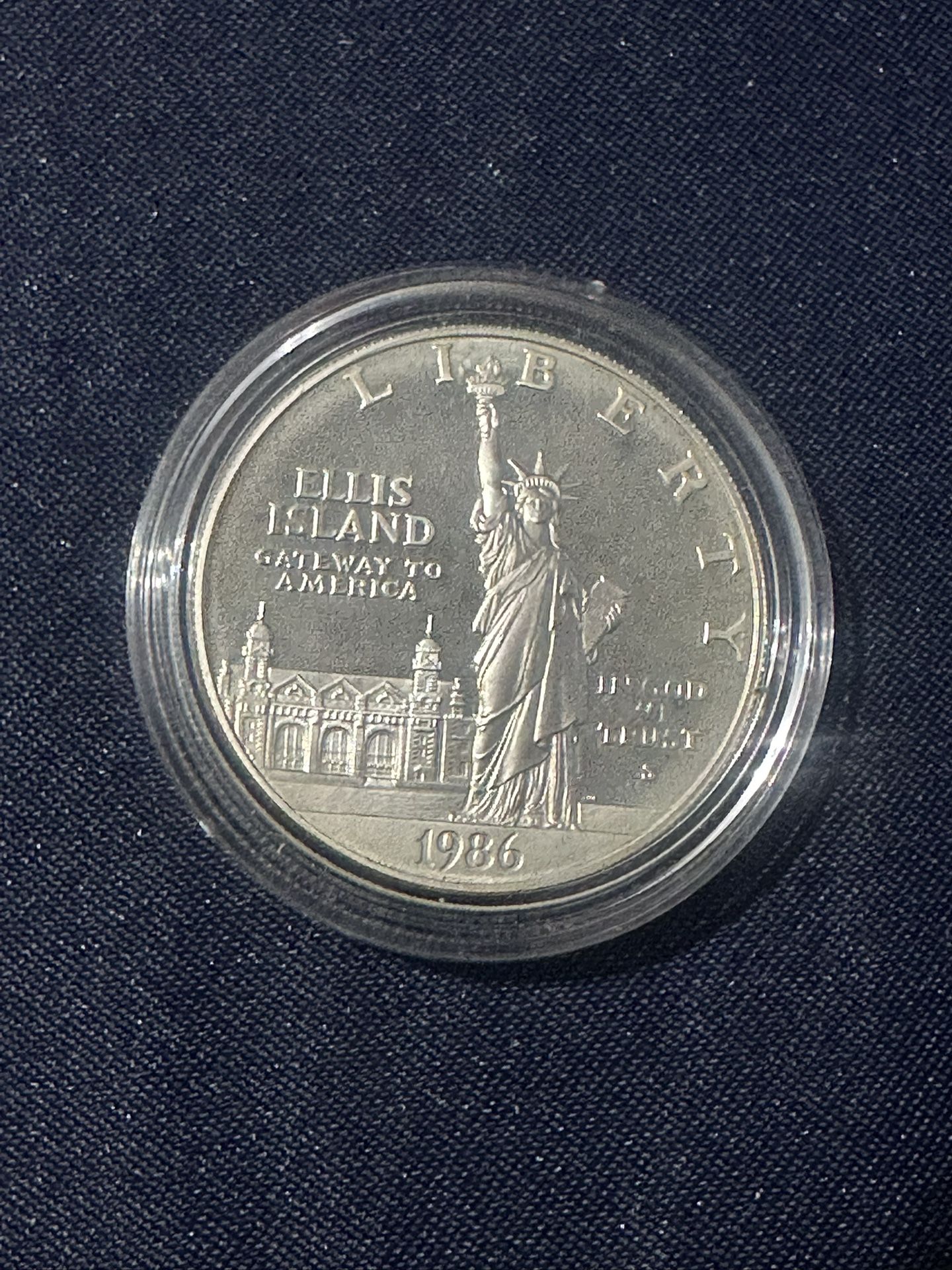 Here we have an 1986 S the coin celebrates the 100th year of the Statue of Liberty. The coins is part of a 6.4 million mintage. The coin is in mint state with some milk toning.