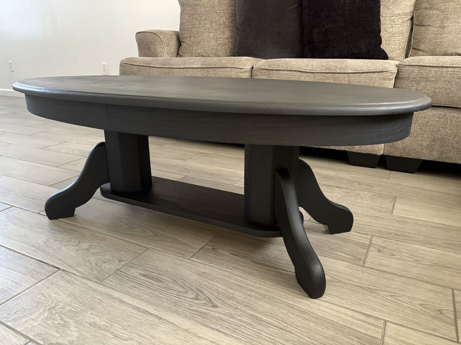 Refurbished to black coffee table, real heavy wood in perfect condition. Lenght 46.5 inches Width 25.5 inches Height 17.4 inches