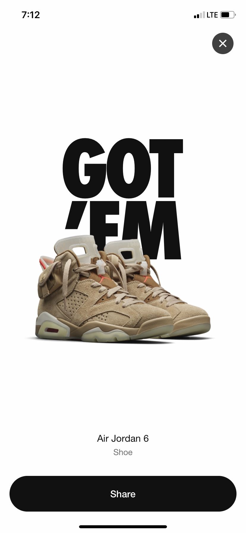 Air Jordan 6 Travis Scott British khaki size 11.5 Brand new purchased off SNKRS app. These have never been tried on still factory laced . Comes with two sets of laces and the extra lace locks are included in the pocket Price can be negotiated