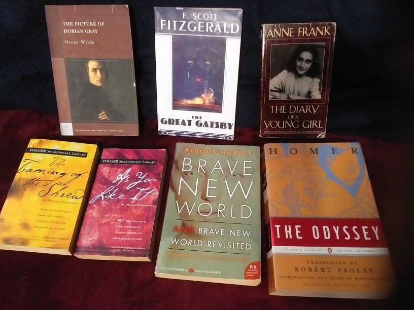 Seven Great classics, suitable for any library or reading table. As follows: Anne Frank the Diary of young girl. The Taming of the Shrew William Shakespeare As you like it by William Shakespeare The Great Gatsby by F Scott Fitzgerald Brave New World by Aldous Huxley The Odyssey by Homer The Picture of Dorian Gray by Oscar Wilde All in good readable condition. Fast shipping from Florida