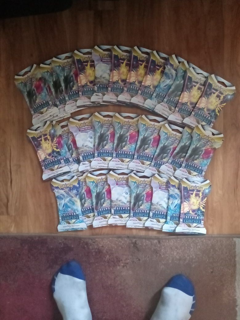 I. Have 40 packs of pokemon silver tempest Sleeved Booster packs And 3 pokemon tins each containg 3 packs So 49 packs for 130$ Price is not negotiable