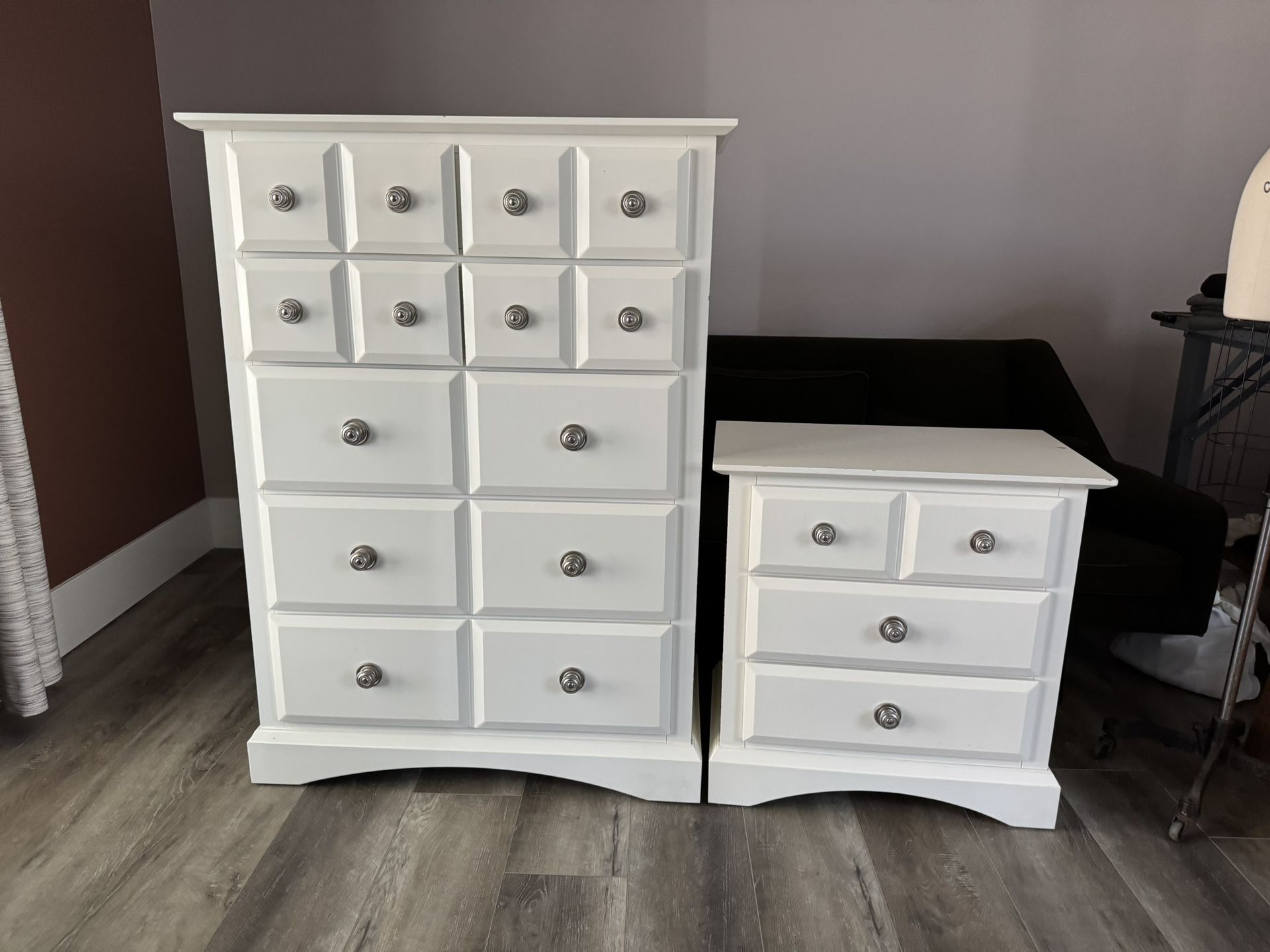 Off white color with silver knobs Solid wood Light chipping on top surface (see photos) but otherwise in great condition Perfect addition to a bedroom! Dresser 38” L 52” H 19” D Nightstand 28” L 28.75” H 16” D