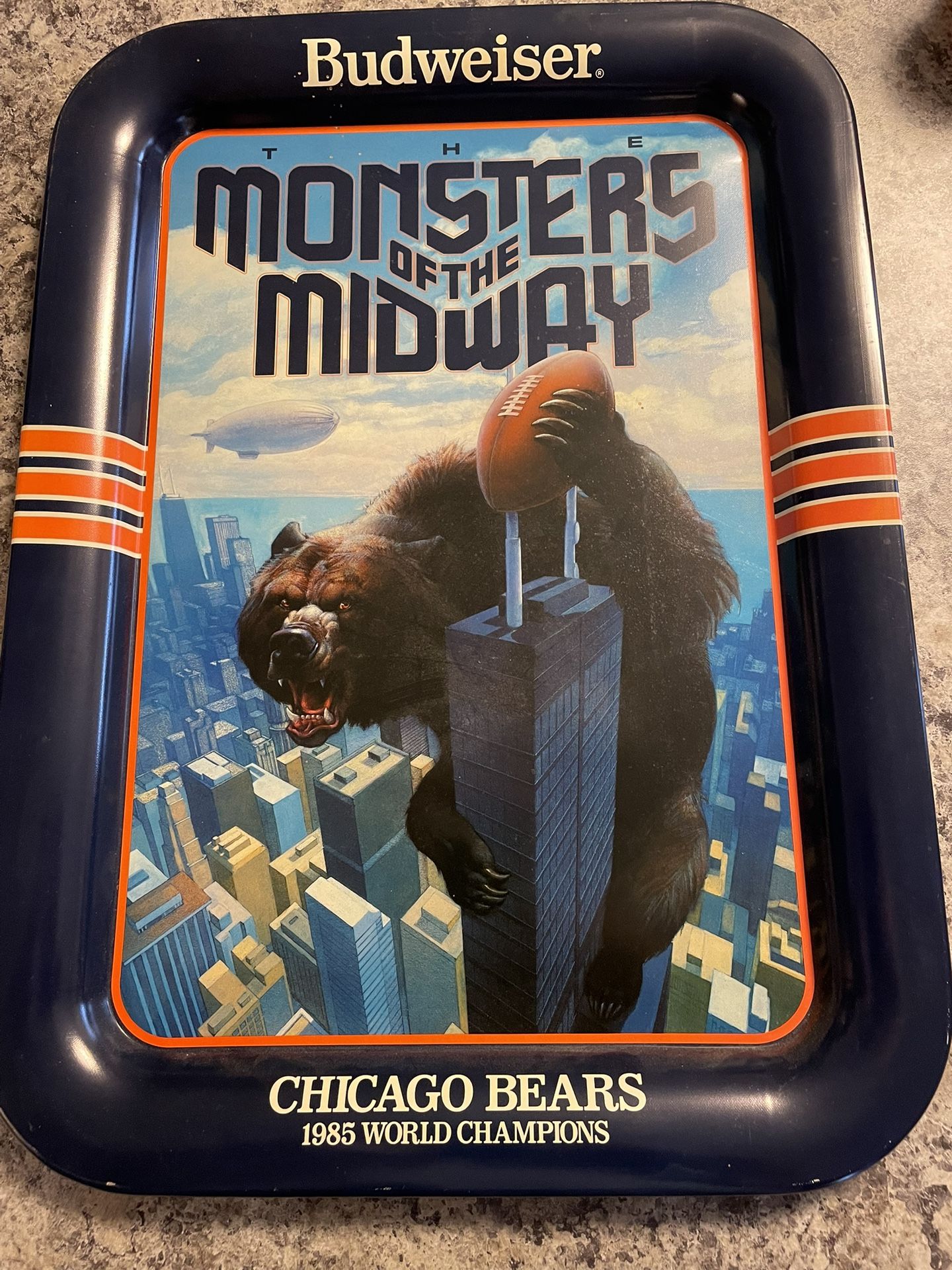 Chicago Bears tray from 1985 commemorating the Super Bowl champs. Perfect condition.