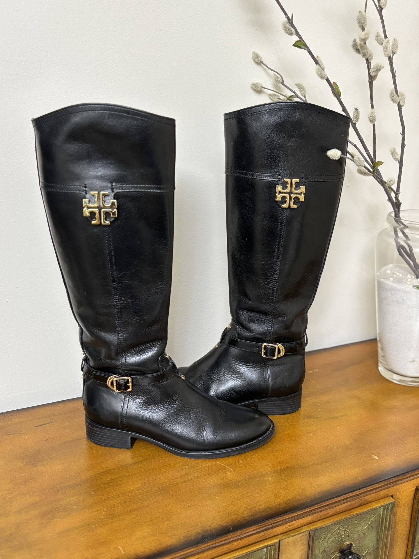 Like new, Tory Burch black leather riding boots with gold logos. Size 7 medium. No scuffs in the leather.
