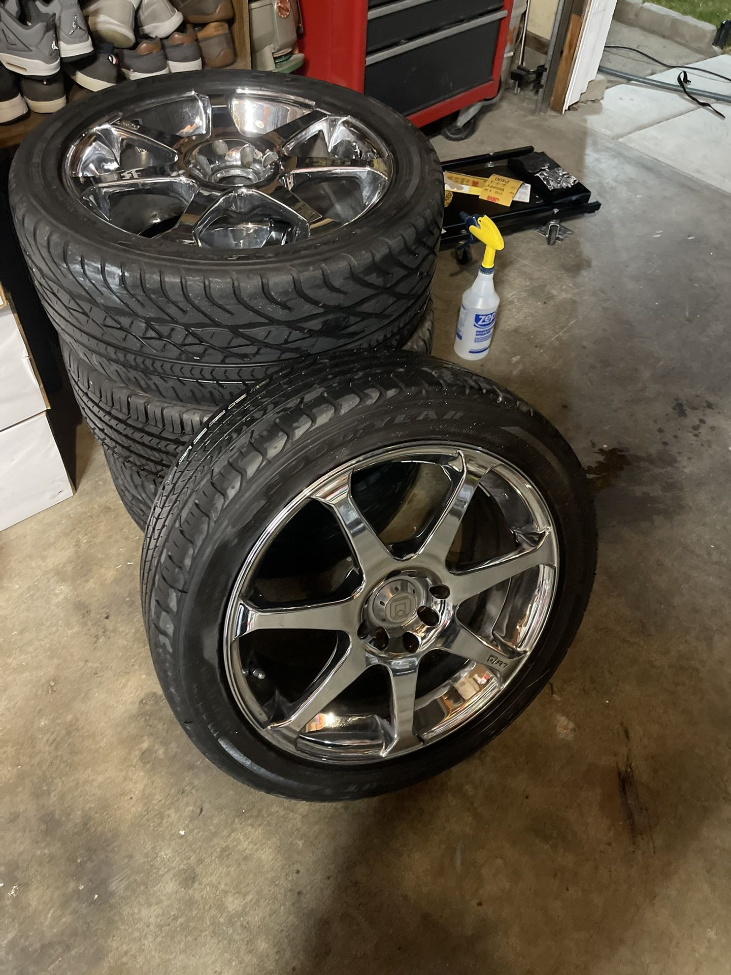 Chrome Motegi Racing wheels Missing two center caps -Squared rims 17x7 -bolt pattern Is universal from 4x100 to 4x114.3 -tires are used good years -tire sizes are 225/45R17 Looking for 300 OBO, first come first serve, no holds