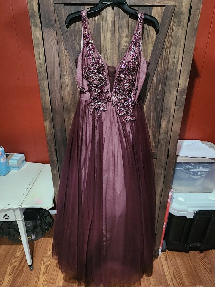 I purchased this as a prom dress but can be used for any special occasion. Size 9, but fits more like an 8 comfortably. Worn only for the evening. Burgundy color with beautiful beading. We had some alterations done to make it shorter due to dragging on the ground,so it can be altered.
