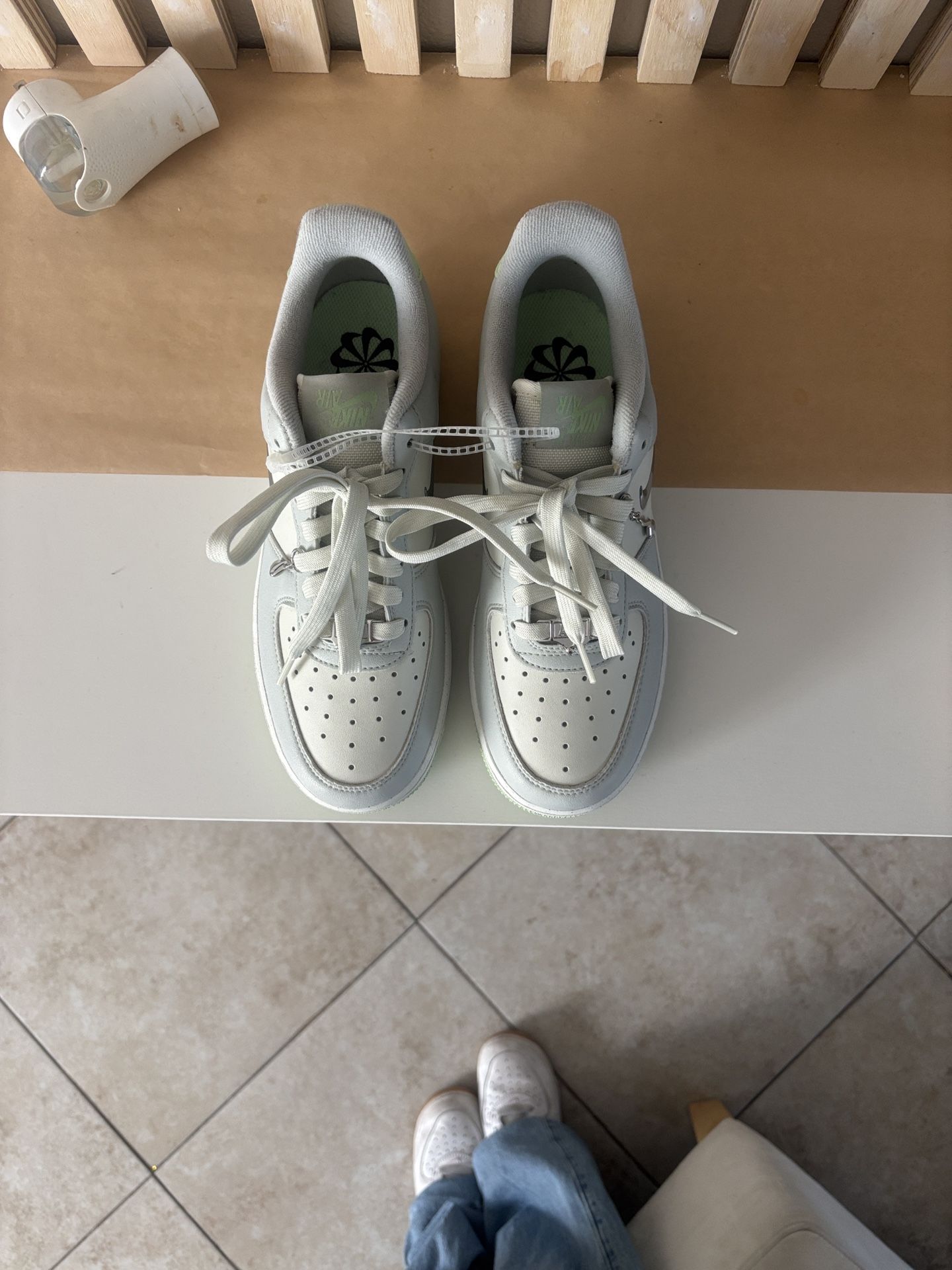 Size 7 women, features metallic swoosh and a green accent sole. Never used, no tags/box.