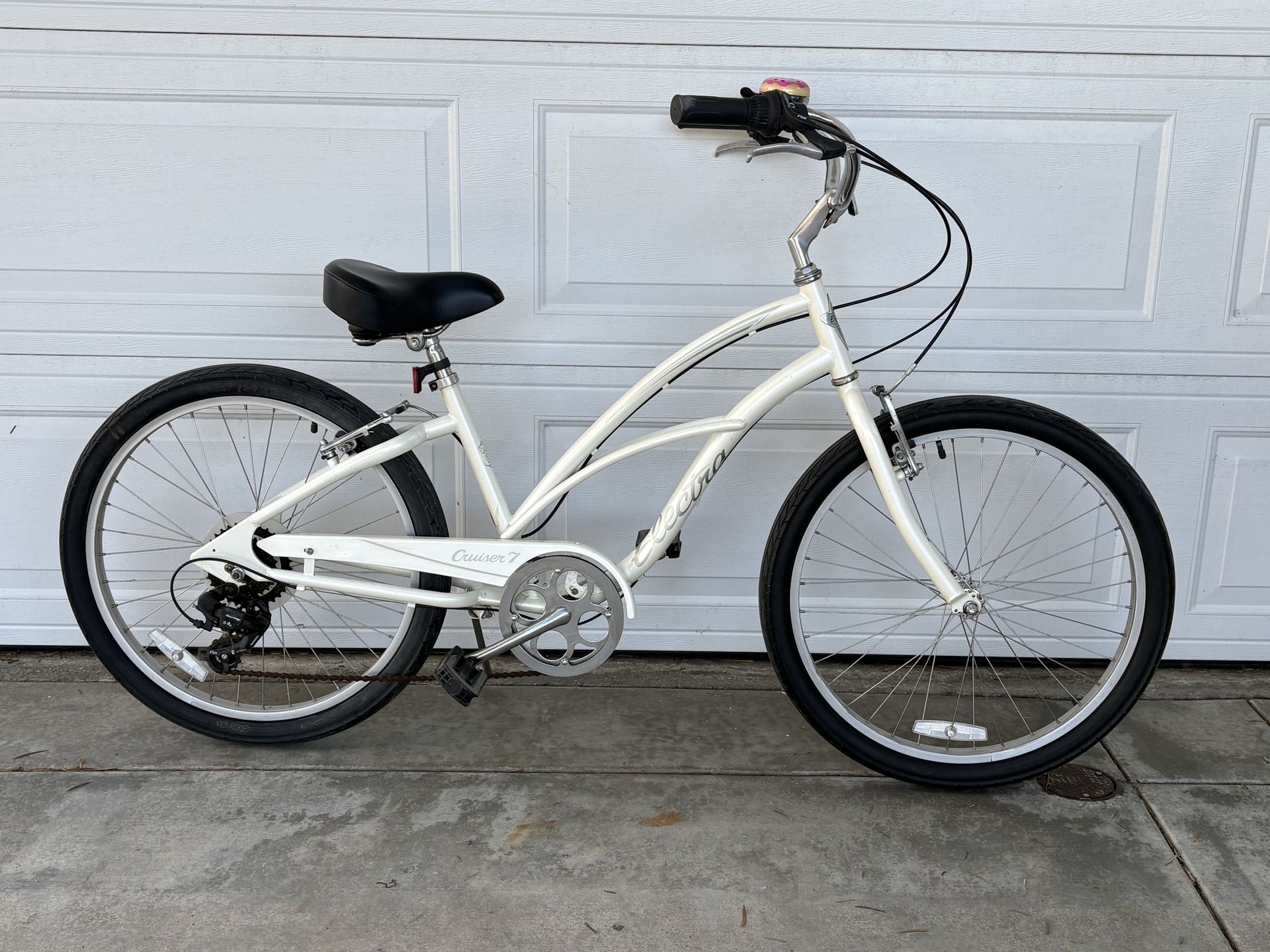 Gorgeous 7 Speed Electra Cruiser 7 Beach Cruiser Bike - 24 inch wheels with front and rear hand brakes - 7 Speed Shimano Gears - Beautiful Shimmery Off-White Paint - Large Electra Gong Bell - Comfy Electra Wide seat - Smooth rolling Electra Tires - Fully Cleaned and ready to ride Bike looks great and rides silky smooth! Reach out with any questions