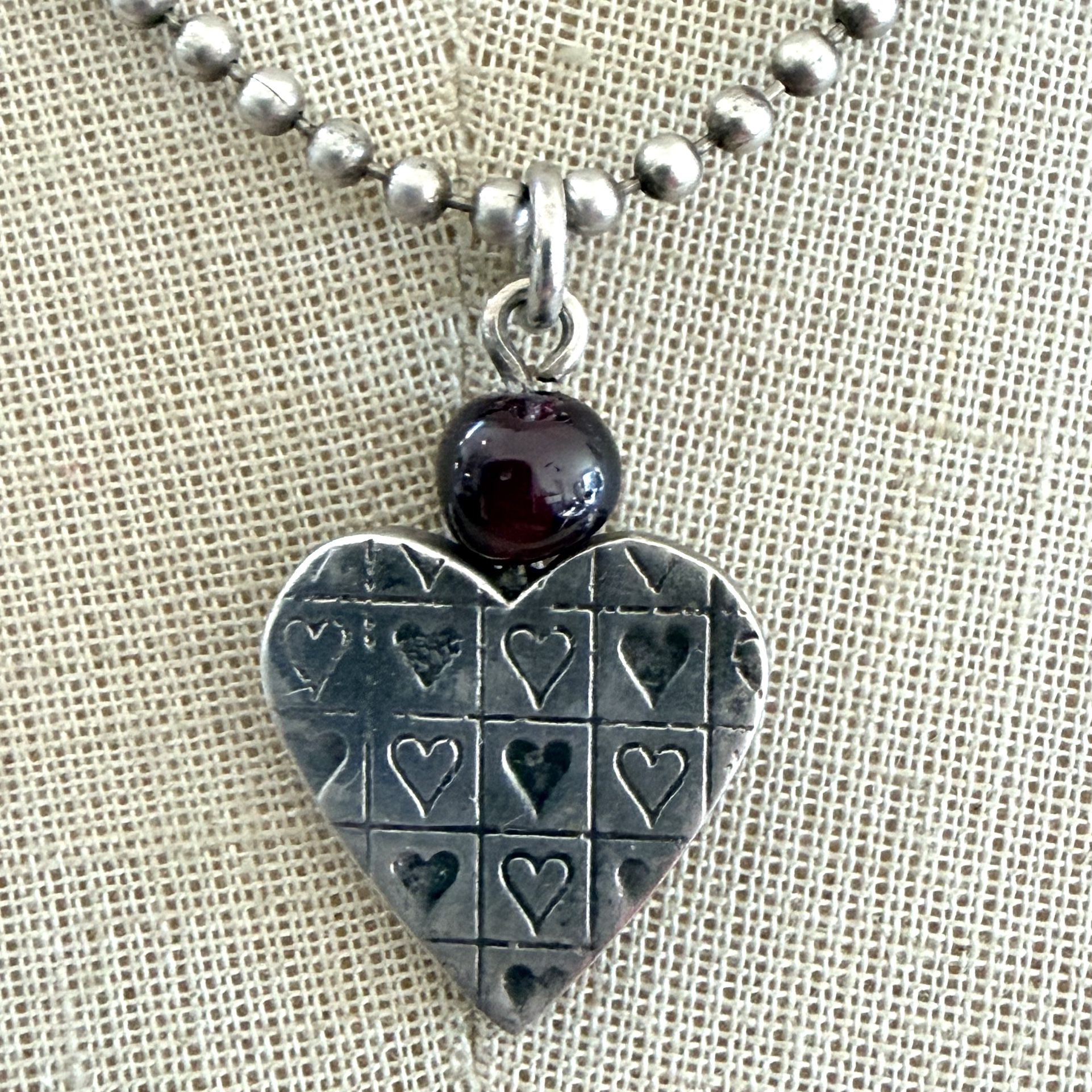 Sterling Silver Heart Pendant Necklace Red Bead Sterling silver heart pendant featuring a charming grid pattern filled with raised and recessed heart motifs. The design has a hand-tooled, slightly rustic look with wonderful texture and depth. A deep red bead sits above the heart, adding rich contrast and a subtle pop of color. The pendant hangs from a classic silver-tone ball chain, giving it an easy, everyday wearable feel while still looking special. Sweet, symbolic, and timeless — this one layers beautifully or stands alone as a statement. Wear this with a cozy sweater or simple tee to let the heart details shine. Condition: Very good