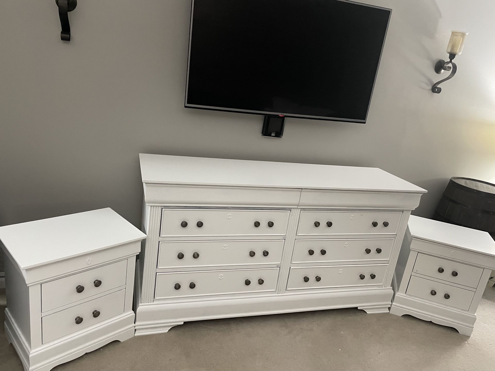 White dresser with 2 nightstands.