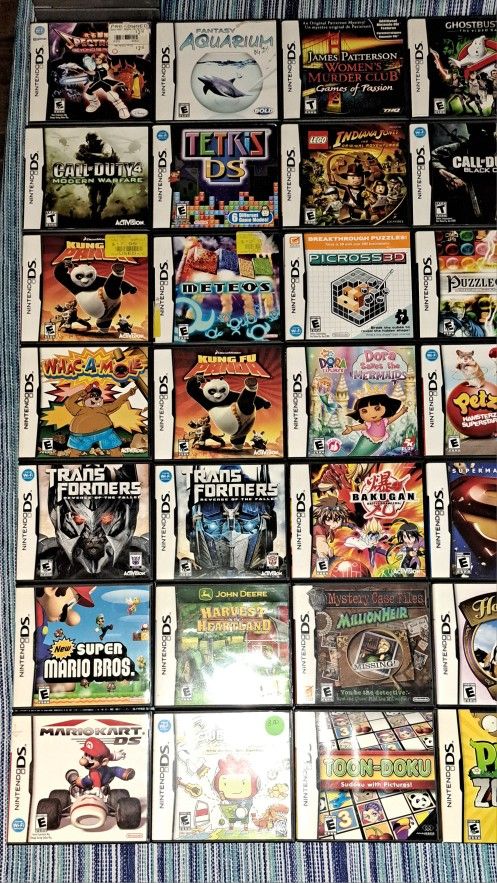 New Super mario bros-24 Mariokart ds-20 Scribblenauts-6 Super Scribblenauts-7 Diddy kong racing ds-18-no manual Plants vs zombies-22 Rubik's world-5 My sims kingdom-8 Animal crossing wild world-44 Animal genius-7 Lego starwars the complete saga-13 Lego starwars the original trilogy-8 Lego Harry Potter years 1-4.-9 Lego indiana jones-8 Harry Potter and the half blood prince-11 Harry Potter and the goblet of fire-9 Avatar the last Airbender-13 (The burning earth) Justice league heroes-10 The incredible hulk-12 Superman returns-10 Bakugan battle brawlers-10 Transformers revenge of the fallen -8 (Autobots version) Transformers revenge of the fallen-11 (Decepticons version) Whac-a-mole-5 Kung-fu panda-8 x2 Puzzle quest-8 Picross 3D-14 Meteos-17 Meteos disney magic-8 Call of duty black ops-16 Call of duty modern warfare-9 Ghostbusters-9 Tetris ds-28 James Patterson-7 Harvest in the heartland-12 Mystery case files millionaire-4 Madden 07- 6 Brothers in arms ds-11 Professor layton and the curious village-16 Professor layton unwound future-19 Scooby doo first fright-12 Civilization revolution-13 Nancy drew-7 Sims 2 pets-8 Logic machines-8 I spy fun house-5 Sprung-8 My word coach-5 Brain age-7 Brain age 2-6 The quest trio-8 Best of tests ds-4 Sudoku gridmaster-9 Brain challenge-7 Club penguin-9 Holly hobbie and friends-10 Imagine Fashion designer- 5- no manual Imagine movie star-2 Petz dolphinz-7 Petz dogs 2-6 Petz fashion-7 Petz tigerz-6 Petz Hamsterz Superstars-7 Fantasy aquarium-7 Pet resort-3 Hamsterz life-6 Spectrobes beyond the portals-17 Lovely lisa-9 Dora saves the mermaids-6 Horse life-15 The daring game for girls-7 Disney magical jewels-6-no manual Silverlicious-7 Ninendogs best friends-29 Ninendogs chihuahua-13 Ninendogs Dalmatian-12 Ninendogs lab-15 Ninendogs dachshund-10 Battleship/sorry/connect four/trouble-7x2 Nintendo ds browser-15 Toon doku-4- no manual The sims 2-27 Touch master 2-9 Mah-jong quest-7 Little league world series-3 Solitaire overload-6 Retro Atari-11 Are you smarter than a5th grader-5 All together its $920. Only a couple games dont have manuals i priced accordingly from (pricechart) and marked which games dont have manuals. If you buy multiple games I can give a better deal. 750 if you buy all 90 games.