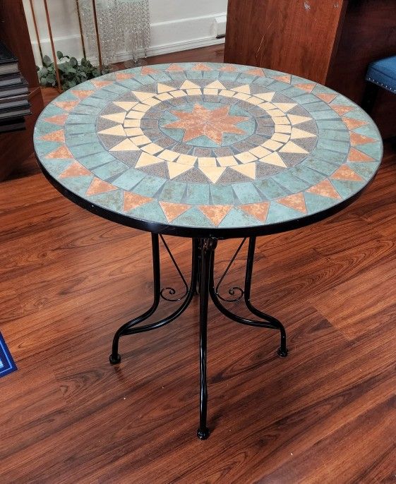 Effortlessly elegant and incredibly sturdy, this 3 Piece Bistro Set is a must-have for anyone looking to enhance their home's decor. Each set includes two folding iron chairs with ceramic tile detail along with a corresponding round iron table complete with matching tiles and mosaic pattern. !!! Assembly required !!!