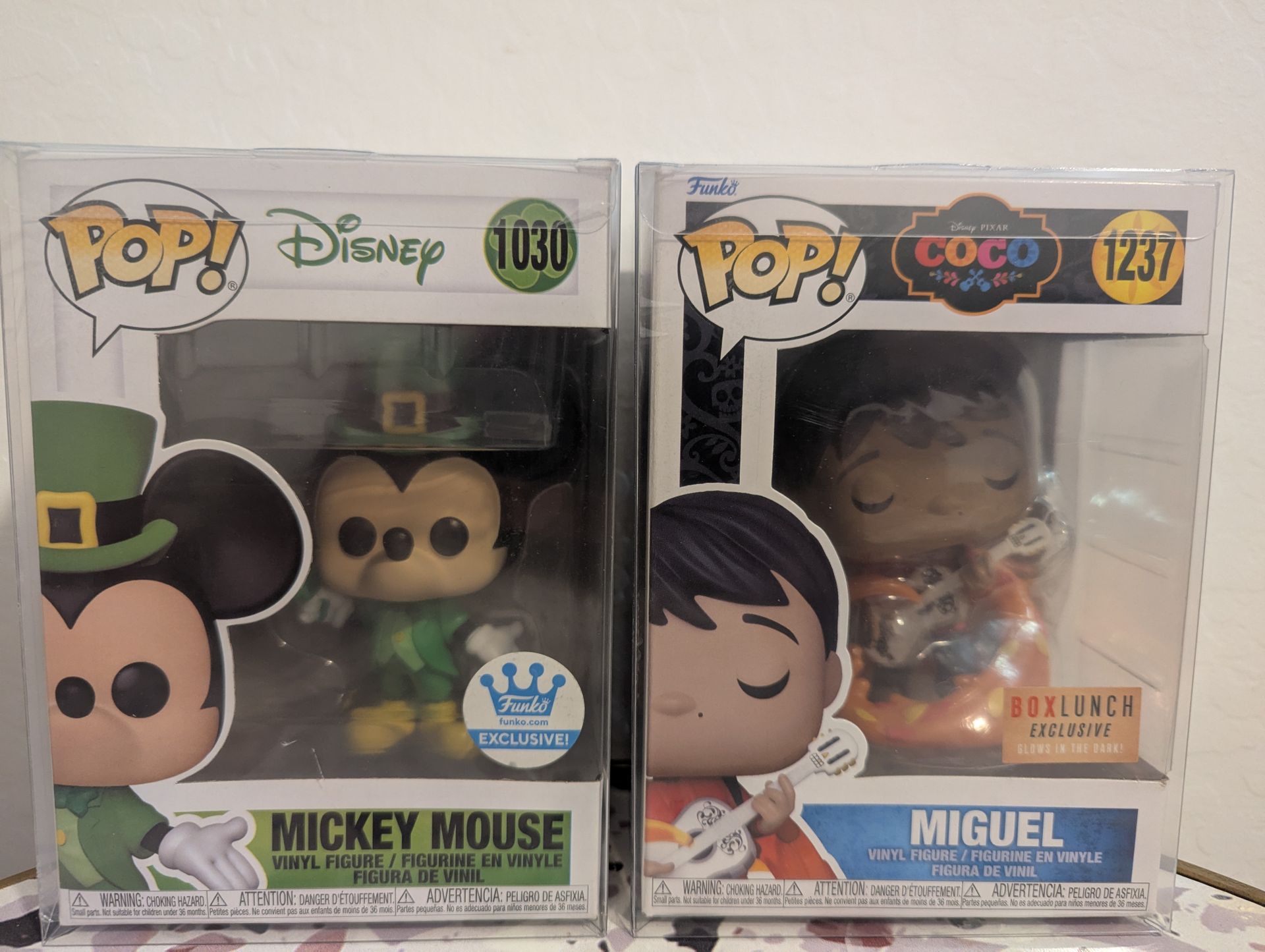 Both pops come with protectors St. Patrick's Day Mickey - $35 Miguel GITD Box Lunch exclusive -$25