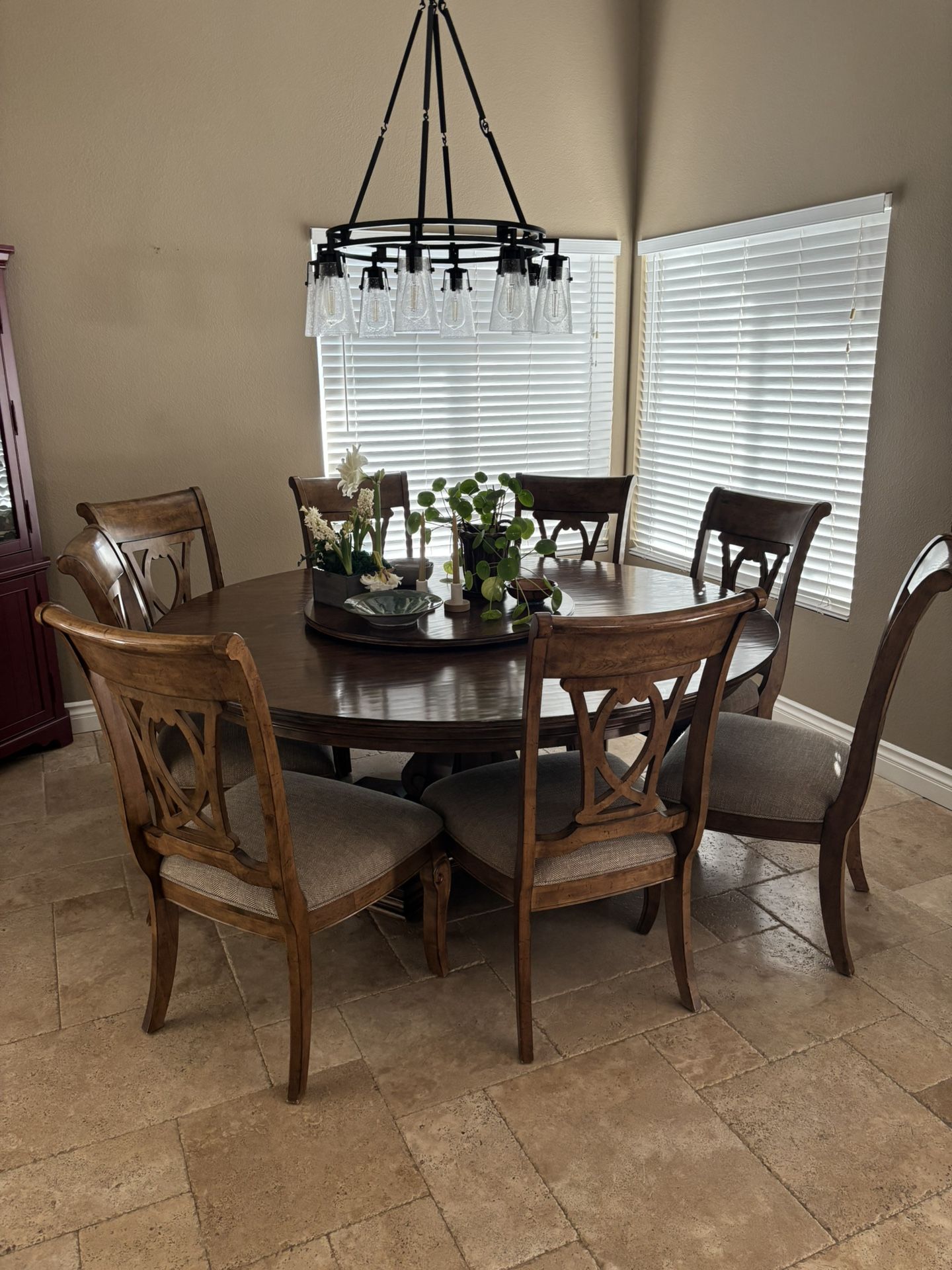 Kincaid 72” round dining set with 8 chairs 30.5” tall Comes with matching 32” lazy Susan Chairs are 42” high with very comfortable 24” wide seats (at widest point) Some normal wear and tear, one stain on one chair, dents/nicks where chairs bump into table when pushed in. Very nice set, just reimagining my space. Pick up in Camarillo, can be taken apart for easier transportation. $1500 (retailed for over 7k)