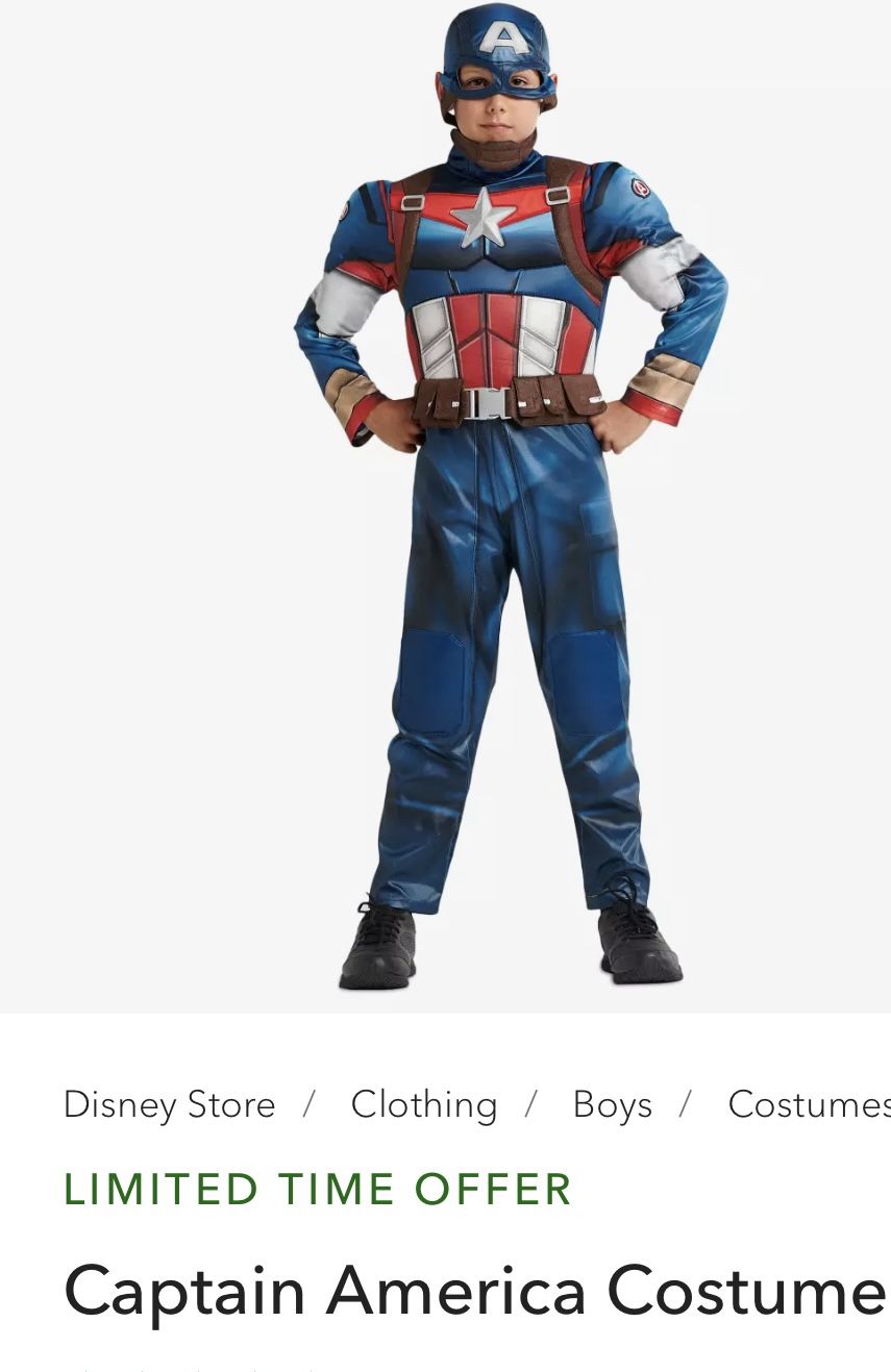 Authentic Marvel Captain America costume for kids. Size : 9/10. Two-piece set includes bodysuit and mask. Right sleeve has secret compartment with removable motion-activated sound box that plays shield sounds (can be turned On/Off with switch).