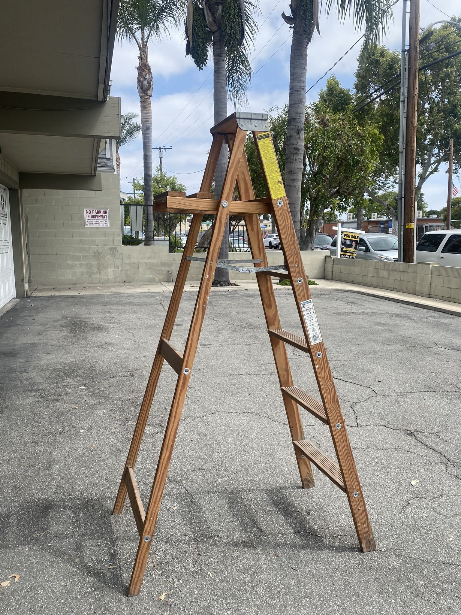 Selling a wooden ladder. It is a little wobbled. Still in good usable condition!! It’s about 6 feet