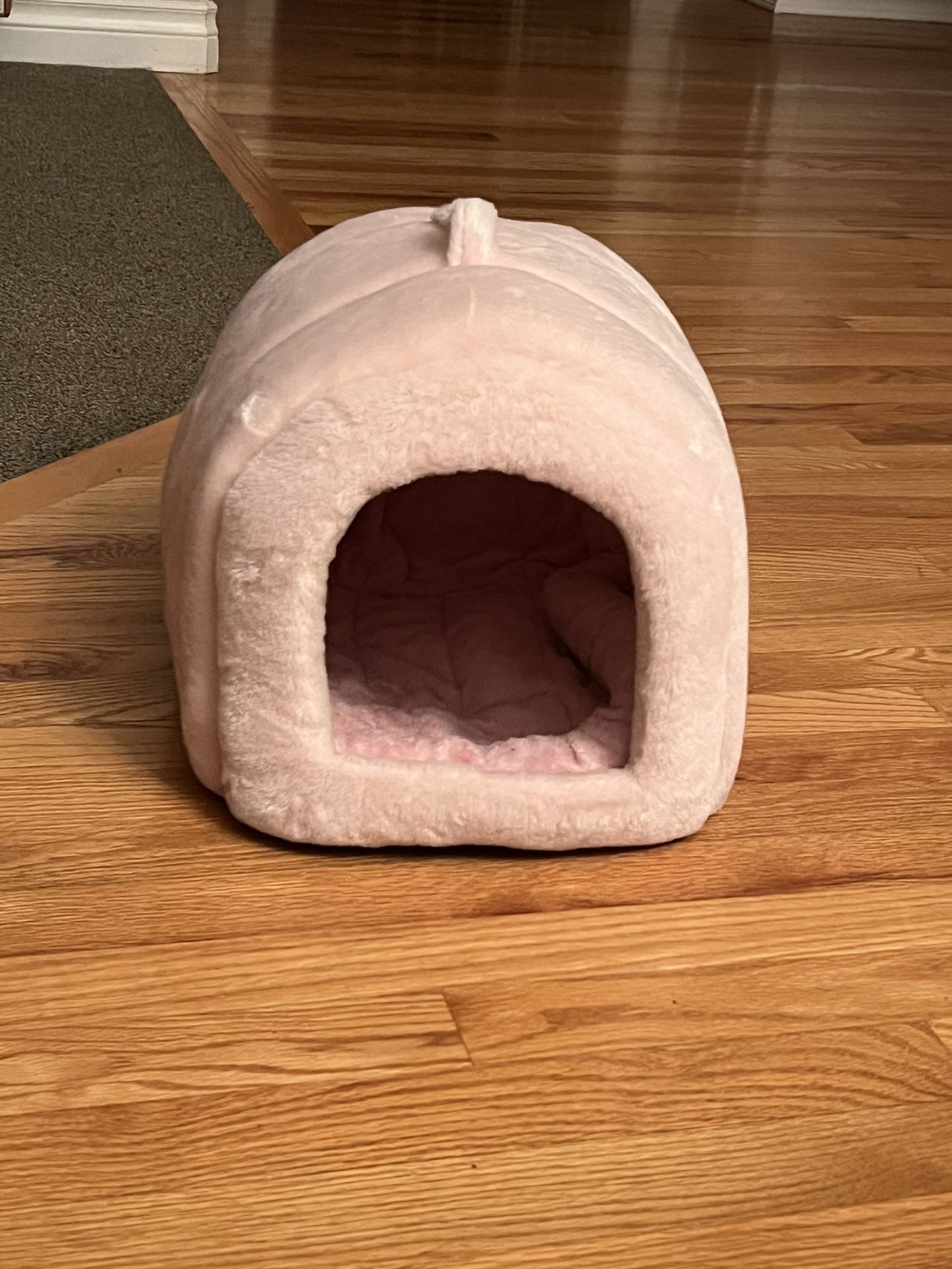 Soft puppy hut with separate soft cushion pillow, pink color. Very good condition. Size small: L 15”, W 10”, H 10”.