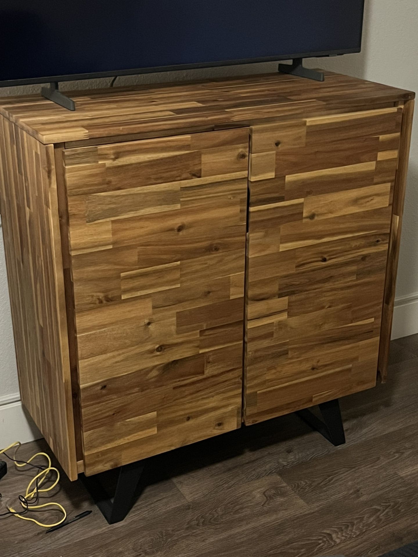 The design and the wood is amazing. This is really a beautiful piece of furniture. No one will sell this less than $600. It has two doors with separate sides with three shelf levels. I’m moving out of state and need to get rid of all my furniture. It’s only about 6 months old and still in brand new condition, not a mark anywhere on it. I've lowered the price as low as I can go to $ 140.