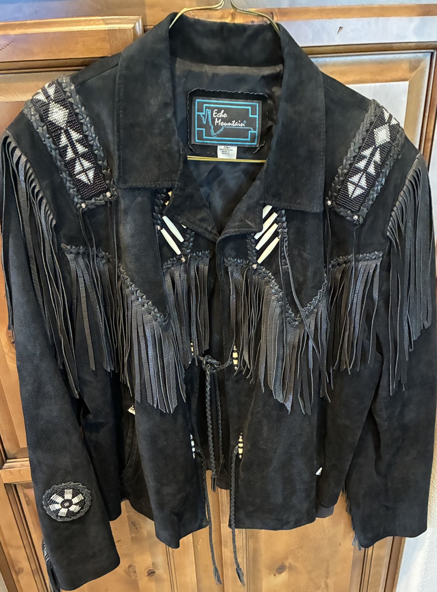 Large black jacket/coat , leather tie closure. Leather braided and bead working on design, ( American Indian, Native American , Soutjwestern , Western )