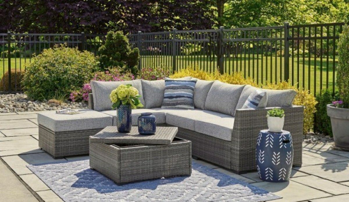 Everything Comes Brand New With Plush, removable cushions Weather-resistant wicker Matching coffee table included #OutdoorSectional #PatioStyle #BackyardUpgrade #BoxDropBaltimore #WickerFurniture #SummerVibes Easy to clean & super comfy & plans available! Turn your patio into a relaxing retreat with this cozy and modern outdoor sectional. Durable wicker frame, soft gray cushions, and a matching coffee table for the perfect backyard setup! Loy and Owned and Operated now and elevate your outdoor space today!
