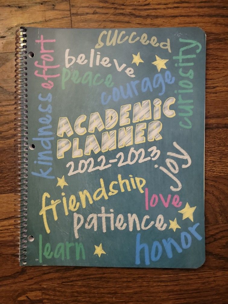 Planner with every month of this year and calendar for 2022-2025 New Condition. Never used Has lots of resource pages for Energy, Math, Cells, Health, ELA, Spelling, Arts, Tips for Success, How to build character, and Special Events. World Map included, and a Reading goal Page