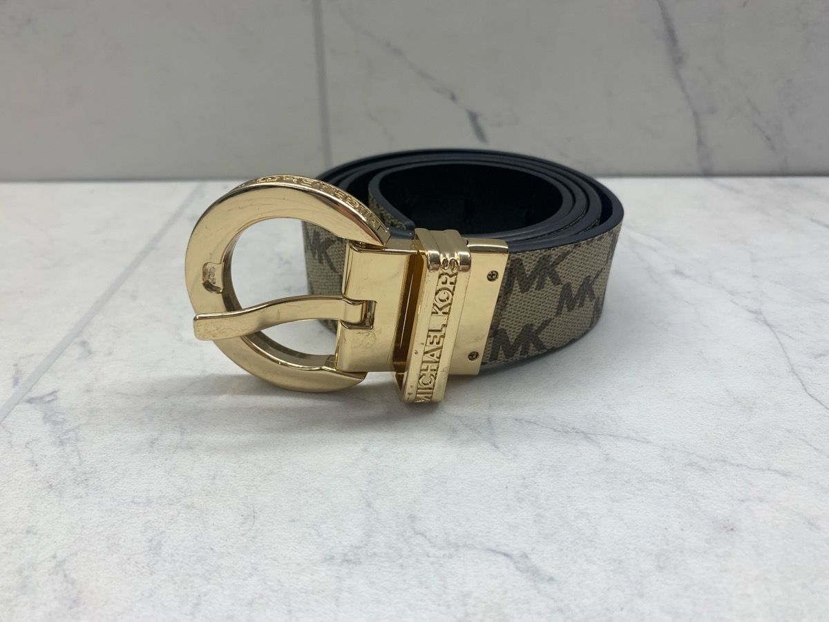 Available now at Pawn Central - Michael Kors Belt in brown and gold. Fashion accessory with MK logo buckle and adjustable fit. Good condition. At Pawn Central, we offer authentication if luxury watches and designer items. We offer layaway payment plans that are interest free. We also provide 90-day collateral loans.