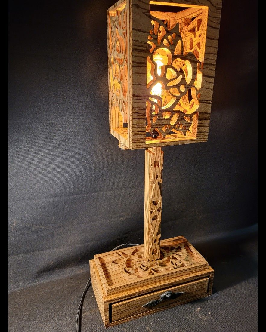 Ustom deaifned and hand crafted wooden lamp, woth treasure drawer. Unique ZEBRA wood from africa.