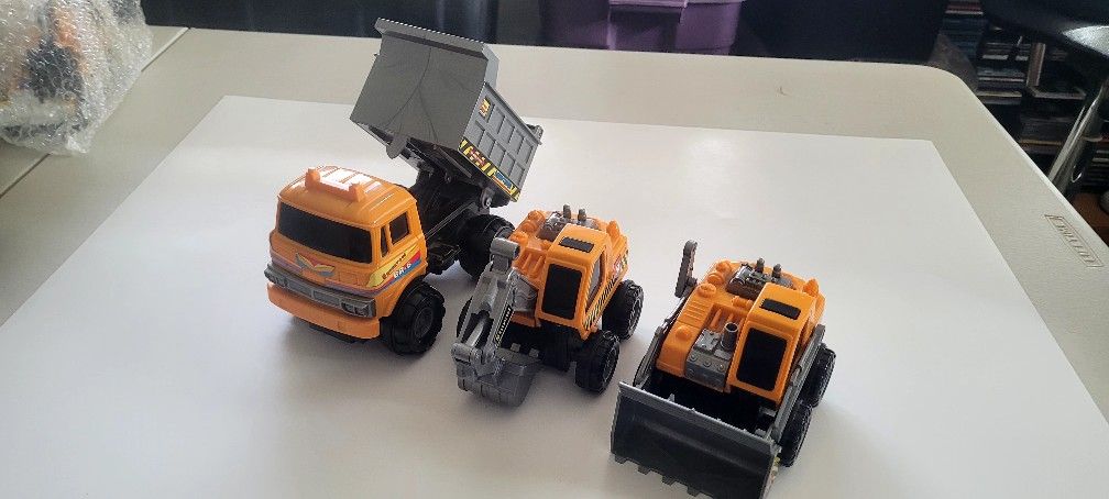 Great construction set by Super Toys. The sett includes a dump truck, excavator , and bulldozer, plus a trailer that hooks to the back of the dump truck. Each vehicle has movable parts. It also includes two construction workers with moveable arms and legs so they can sit or stand. This is in excellent condition. It is designed for 4-7 years of age.