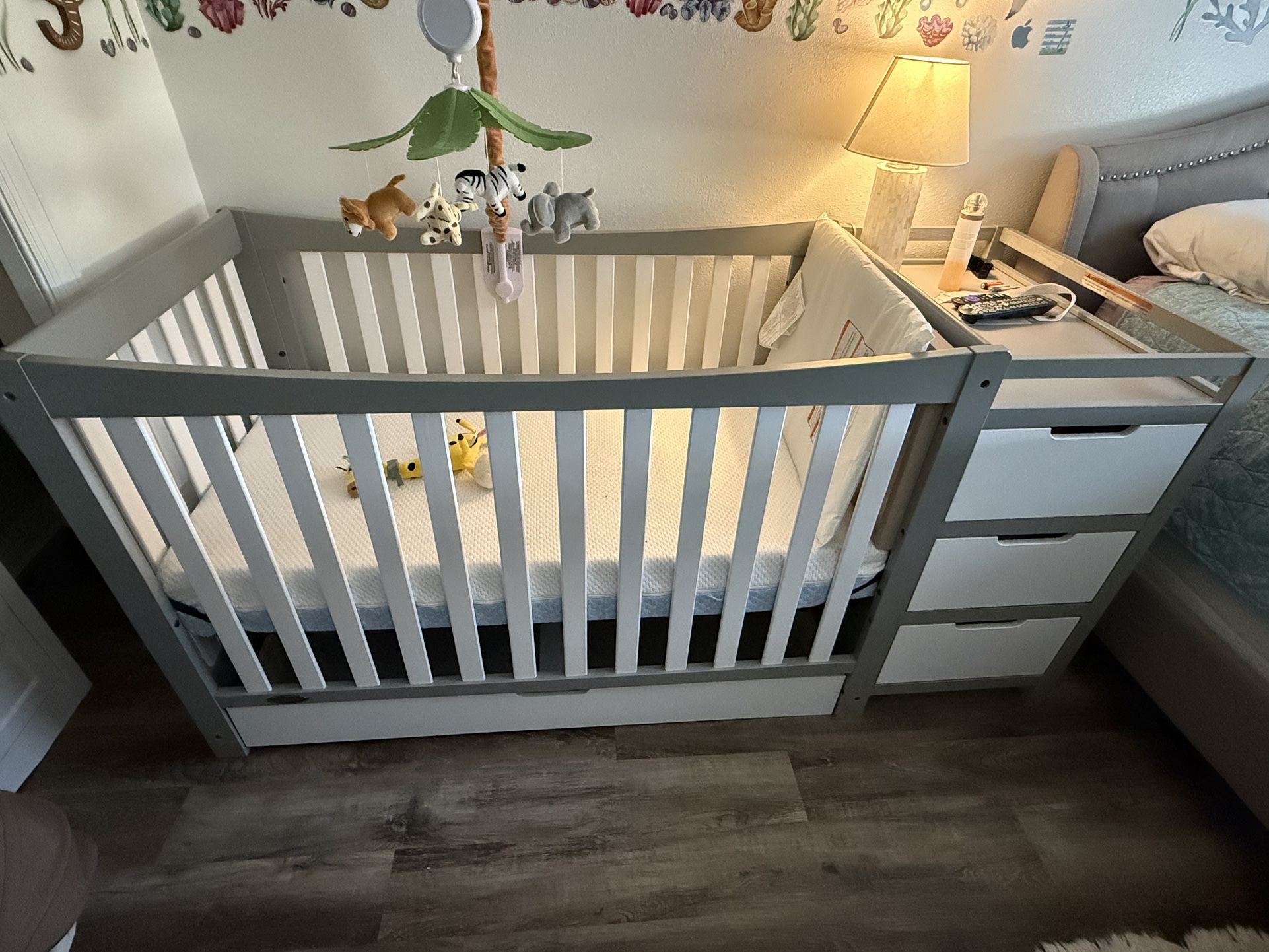 Clean gray and white baby crib. Has attached changing table with 3 drawers. Also pull-out storage drawer under crib. Mattress included.