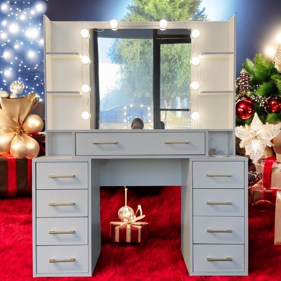 Glass Top Vanity Desk with Mirror and Lights, Large Vanity Makeup Mirror Desk with Chargin