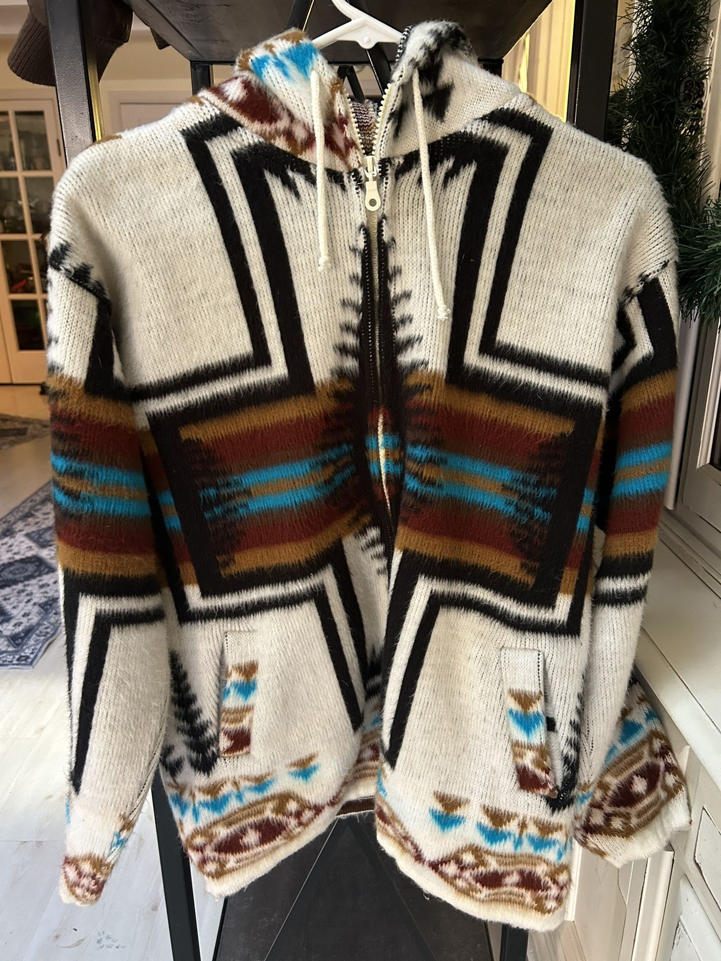 These jackets are handcrafted by Ecuadorian artisans in the Andes Mountains using the traditional foot loom technique. The luxurious alpaca jackets are beautiful and unique and will keep you warm during winter and fall with style. These jackets have zippers, hoods, and pockets. Women and men can wear them. 80% Alpaca 20% Acrylic Size medium Cash only please