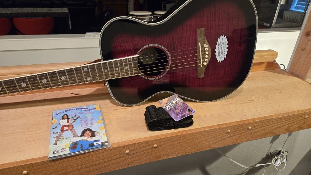 This acoustic/electric guitar is set up and ready to play. Comes with a neck tool, strap, learning DVD, onboard tuner and case. Sounds and plays great. And stays in tune. $200 obo.