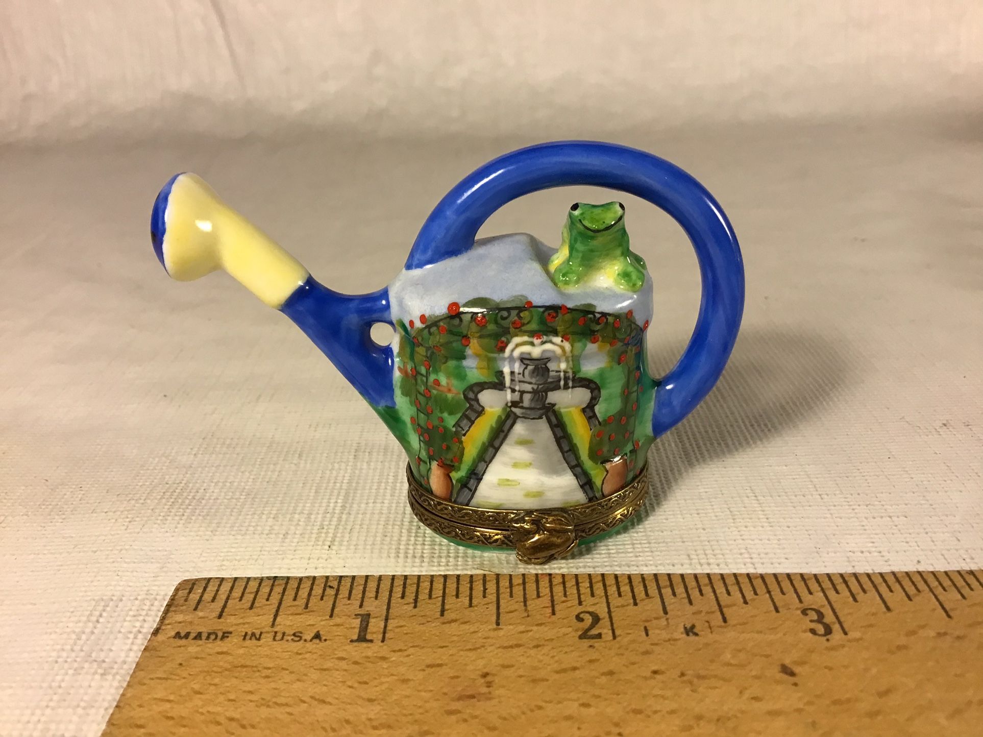Hand painted Limoges (France) watering can dresser box from the “In The Garden” limited edition, #132/500, with a brass frog clasp, in perfect condition. Note: if this ad is still posted, the item is available (we remove postings when they are sold)