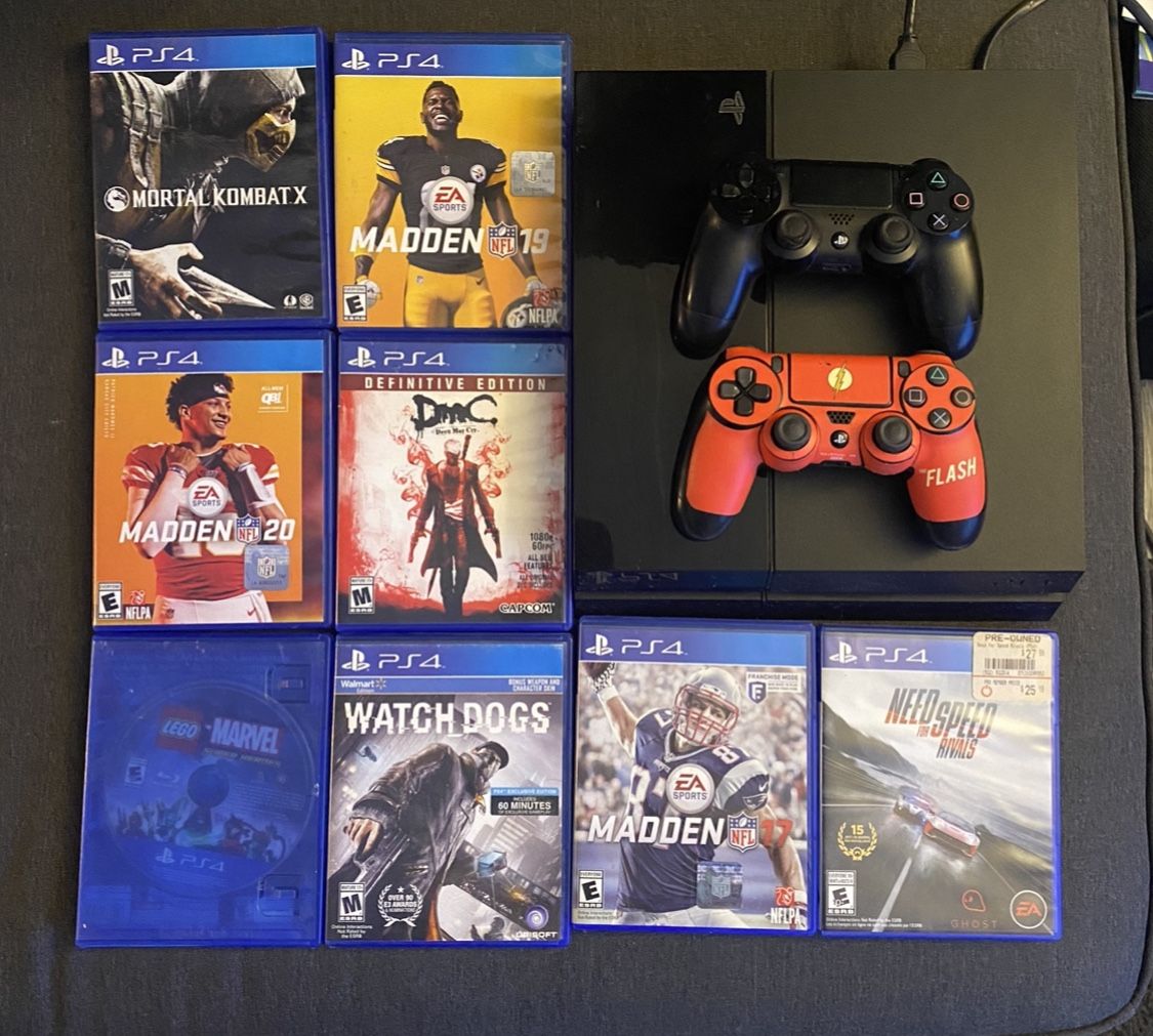 Play station four with two controllers, and eight games, one of the controllers the R1 button spazzes out. 170$ OBO