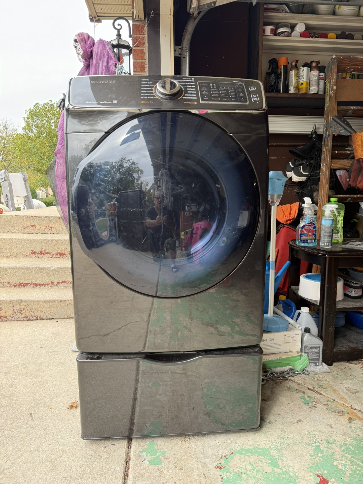 27 wide-32deep-51 high on pedestal 38without pedestal, pedastle adds 13 inches. It is in PERFECT condition. It’s only a couple years old, my washer was older and crapped out so I got a brand new set. $450 OBO. Will not entertain lowball offers or trades.