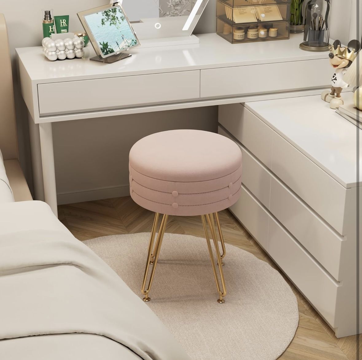 Space-saving: This makeup vanity chair features storage functionality, serving as both a makeup stool and a storage unit. This stool for vanity ample space for cosmetic, curling iron, jewelry and more, helping to keep things organized and reduce clutter Comfort & Durable: VECELO chair for vanity desk features a high-density foam cushion and soft velvet fabric. This makeup chair for vanity with sturdy metal frame and durable materials ensure long-lasting use and good looking Anti-Slip: The metal legs of this vanity stools are equipped with anti-slip pads, ensuring safety while protecting the floor. The legs are filled with metal for added stability during use Easy to Clean: This girls vanity chair is made with waterproof, stain-resistant fabric for easy cleaning. Any makeup or skincare spills can be quickly wiped away, keeping the small vanity chair looking fresh Modern Design: With a minimalist design, this vanity chair no wheels comes in white, pink, and black to match various home styles