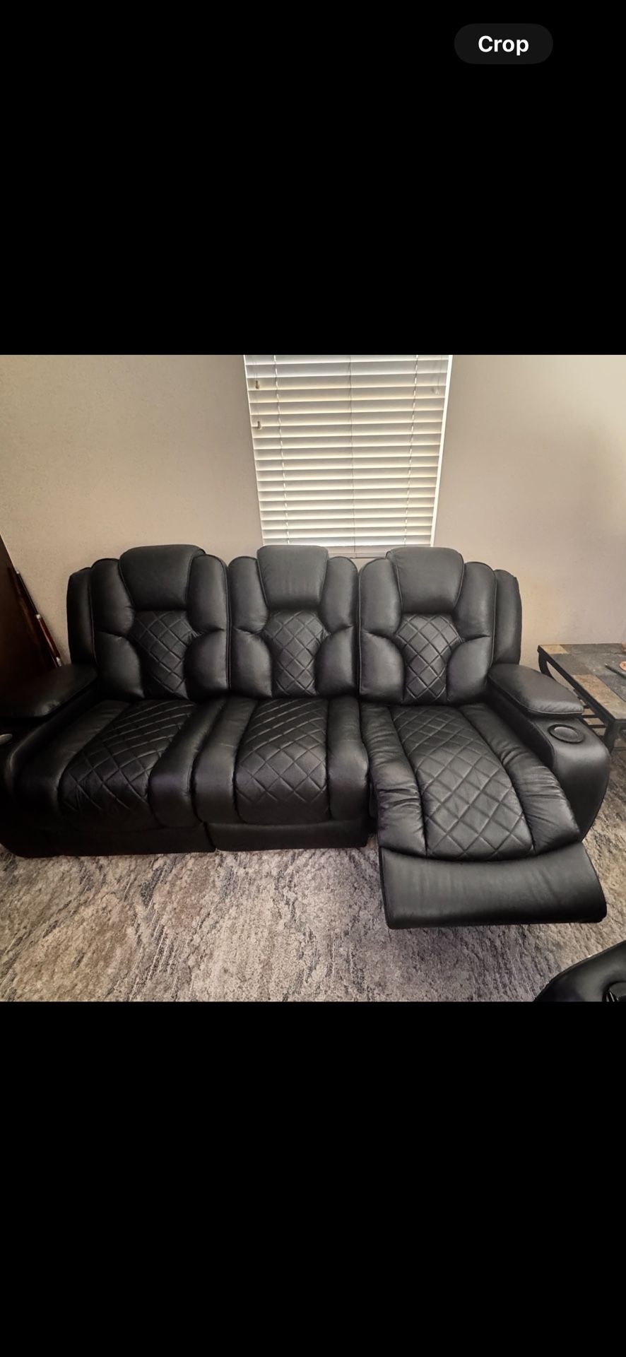 Leather power reclining sofa and recliner. Great used condition. Wall hugger design. Center of sofa has power center as well as usb plugs on either end, recliner has usb plug as well. Smoke free, pet free home.
