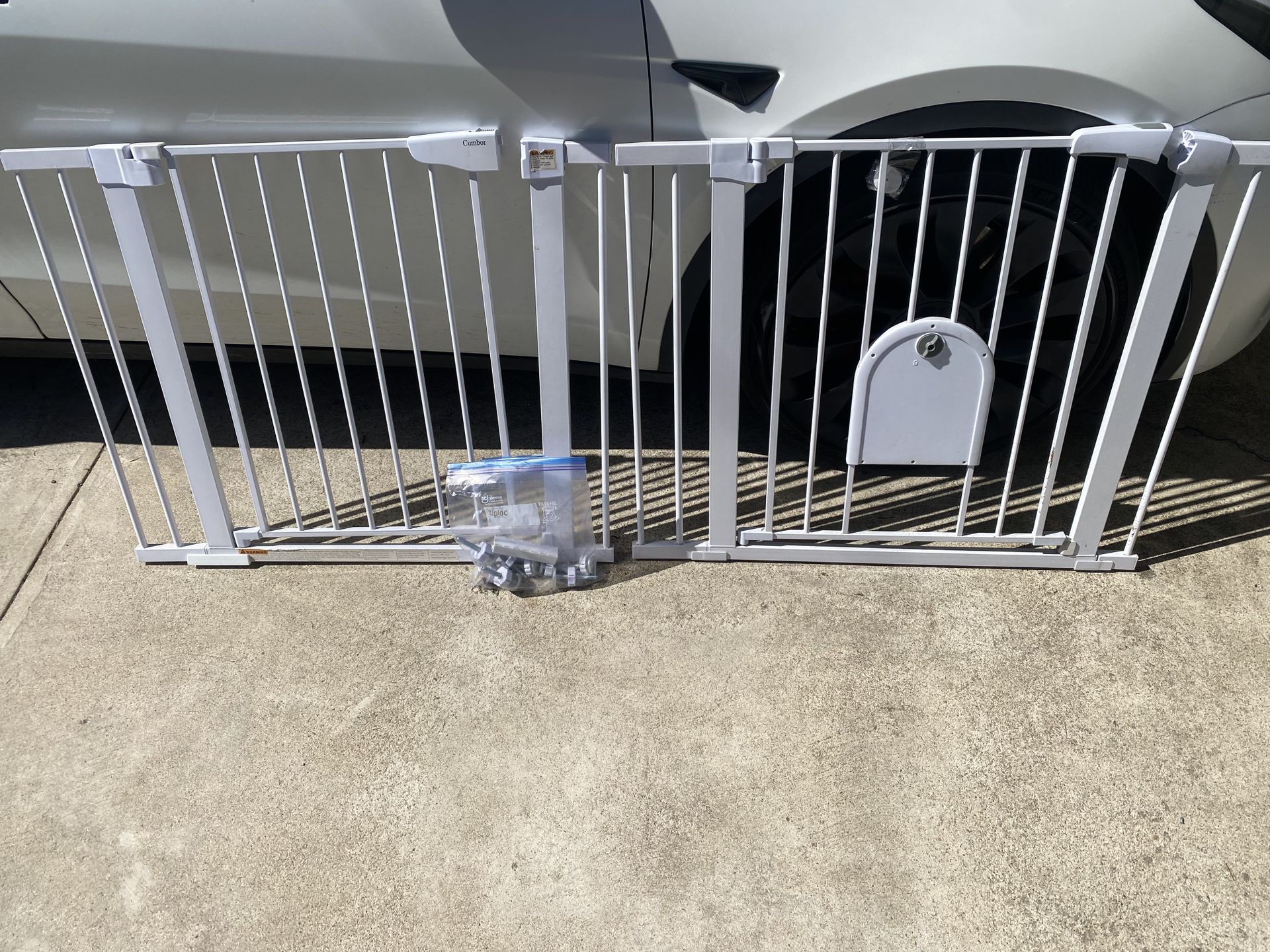 2 baby gates. One has a cat/small dog door. Some scratches on the pet door one. $20 for both $10 for the pet door (with scratches) $15 for the non pet door Paid around $60 each