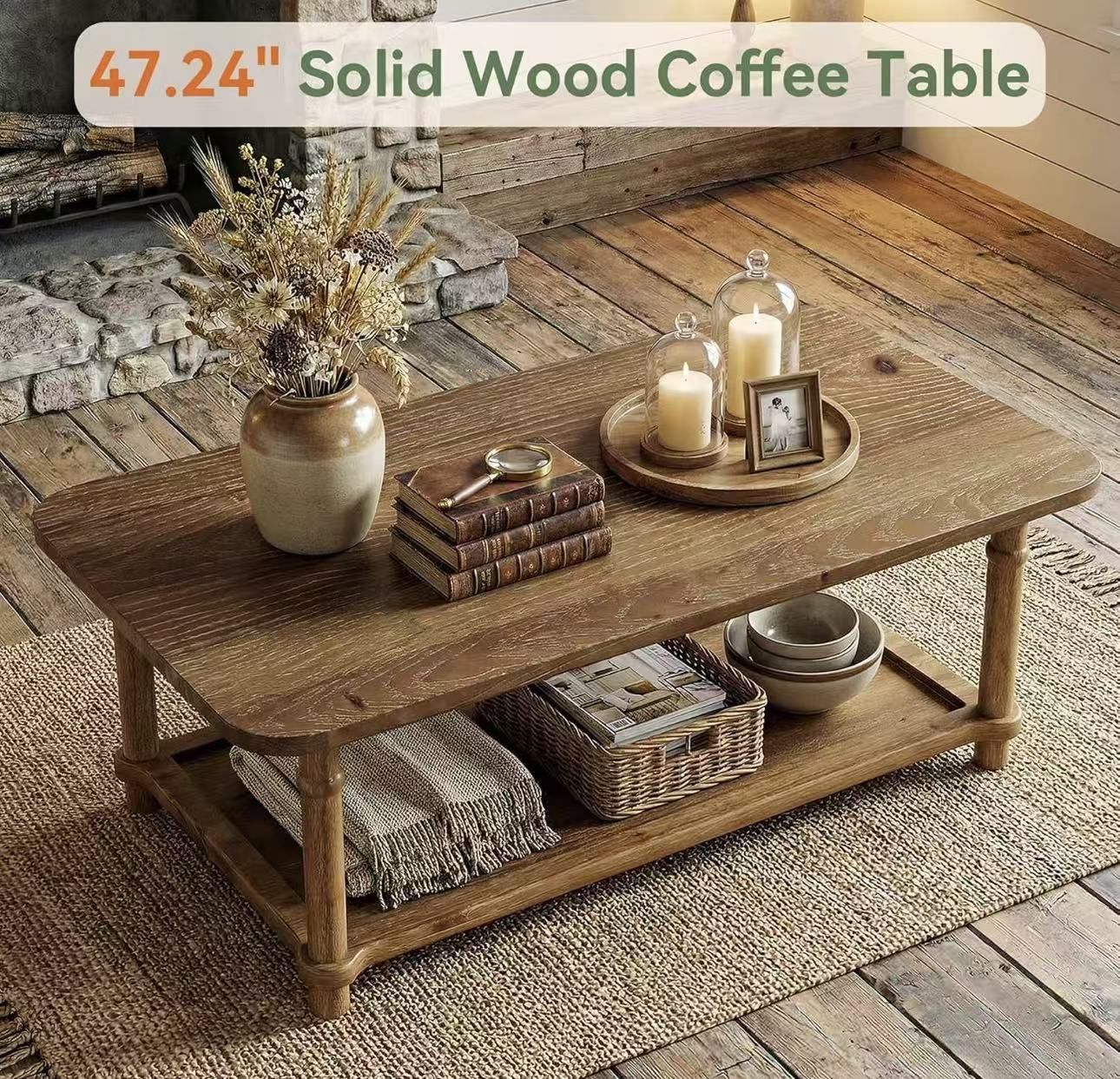 LD0161 new assembled 47" Rectangle Coffee Table, Solid Wood Center Table with 2-Tier Storage, Modern Farmhouse Coffee Furniture for Living Room, Home