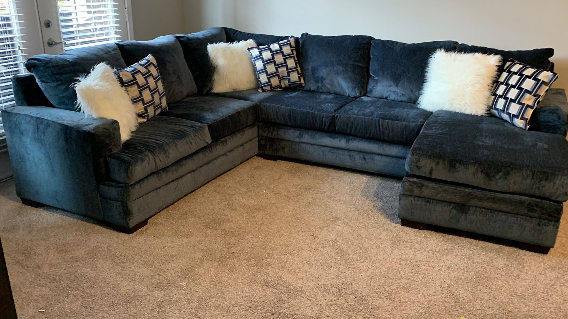 Large Solid Wood Frame Sectional w Pillows Velvet Fabric very Comfortable. Will fit in Apartments Townhomes Great for Vacation Rentals like Vacasa Airbnb Vrbo. Furniture is in the original manufactures packaging. I deliver. I setup