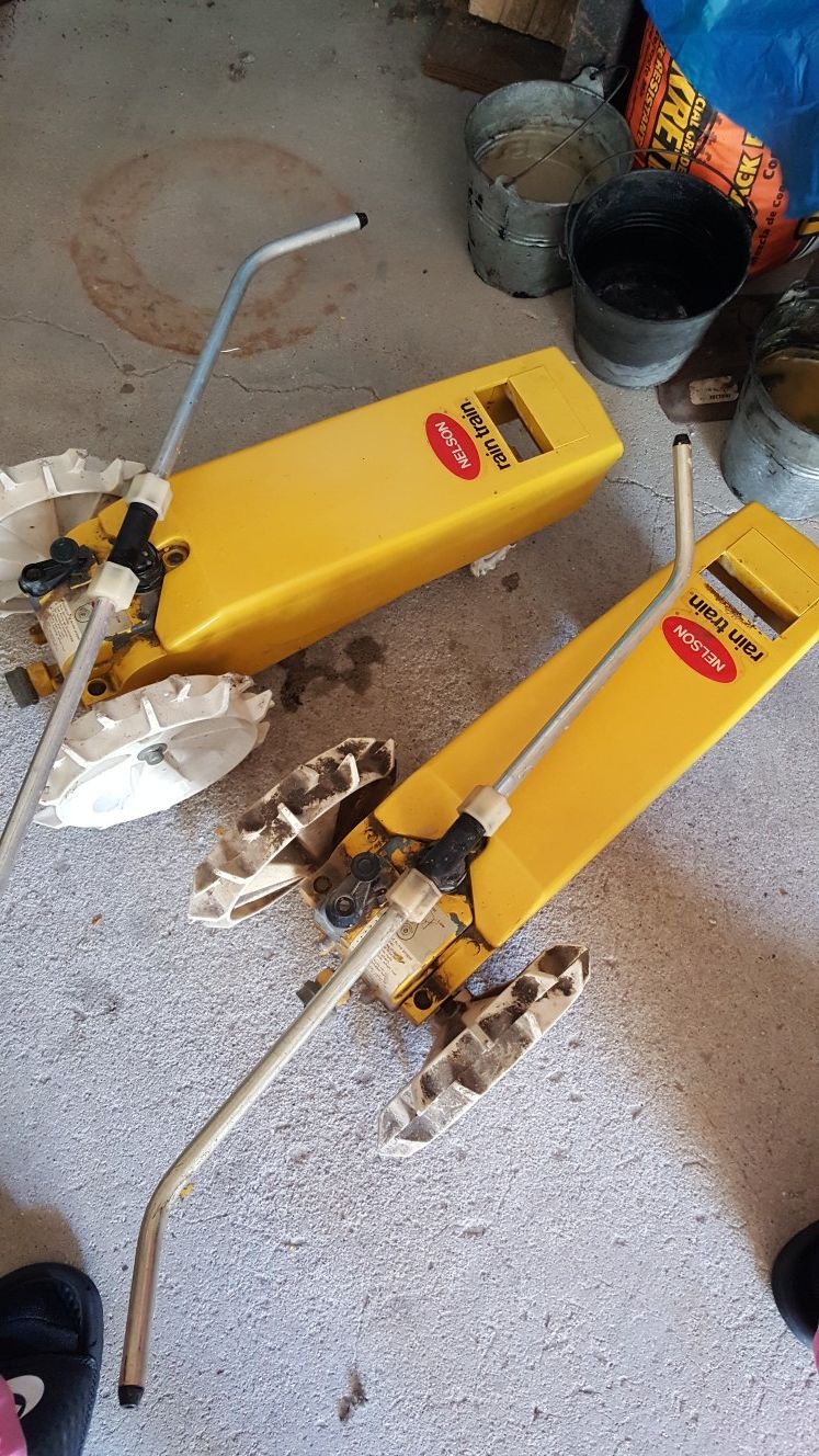 This Nelson Rain Train Traveling Sprinkler can cover up to 13,500 square feet which makes it ideal for medium to large lawns. It follows the path set out by the hose and automaticlly stops when it reaches the designated stopping point. FeaturesCovers up to 13500 square feetTravels up to 200 feetPropels across the lawn following the pattern you lay out with the hoseEquipped with 3 speed settingsDesigned to automatically shut off at any given point along your hose trackIdeal for medium to large lawnsCast iron body with chip resistant powder-coat paint Selling as a pair.