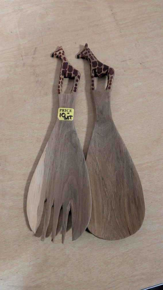 Vintage Hand Carved Wooden Giraffe Salad Server Utensil Set African Decor Art
