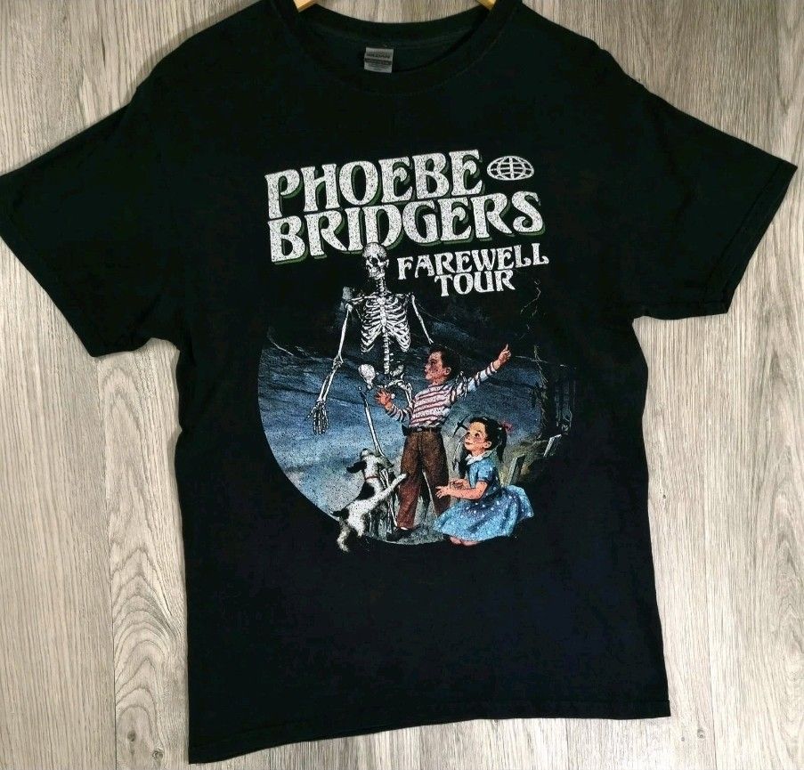 Black Gildan Heavy Cotton tee from the Phoebe Bridgers Farewell Tour, featuring a striking skeleton and children graphic design on the front. Tour-style print with bold lettering and vintage-inspired artwork, making it a standout piece for fans and collectors. Medium size, classic fit, short sleeves. A must-have for Phoebe Bridgers supporters or anyone into indie/alternative band merch.