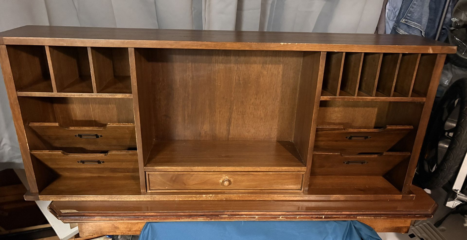 Organizer hutch with divided cubbies and slots with one long drawer Multiple cubbies for storage with easy access Wide and sturdy handmade Classic vintage piece , built to last!