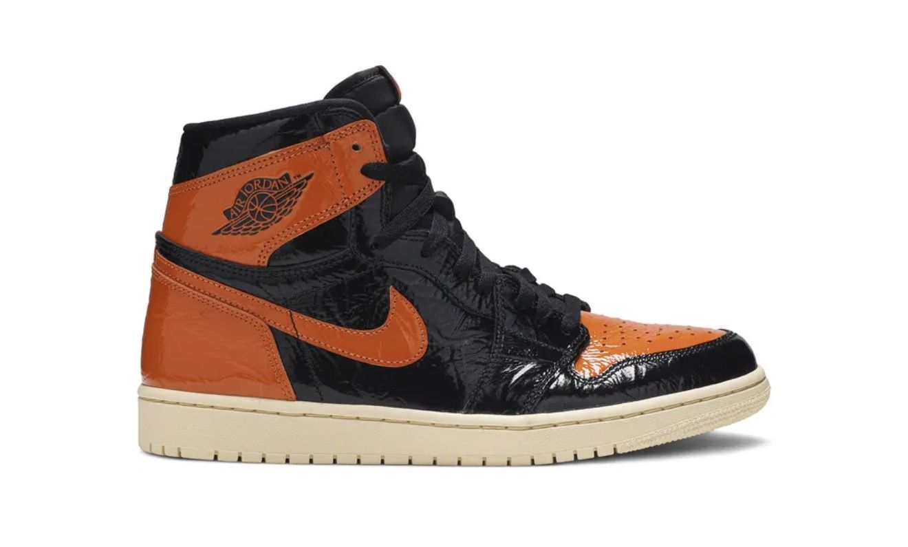 Size 14 men’s No box. The Air Jordan 1 Retro High OG 'Shattered Backboard 3.0' revisits a coveted colorway inspired by a Michael Jordan backboard-breaking dunk that took place during a 1985 Nike exhibition game. The shoe's colorway of black, Pale Vanilla and Starfish matches the colors of the jersey MJ sported that day. Released in October 2019, this third edition of the sneaker features a crinkled, glossy patent leather upper that alludes to the hoop's broken glass, a fitting tribute to an early iconic moment.