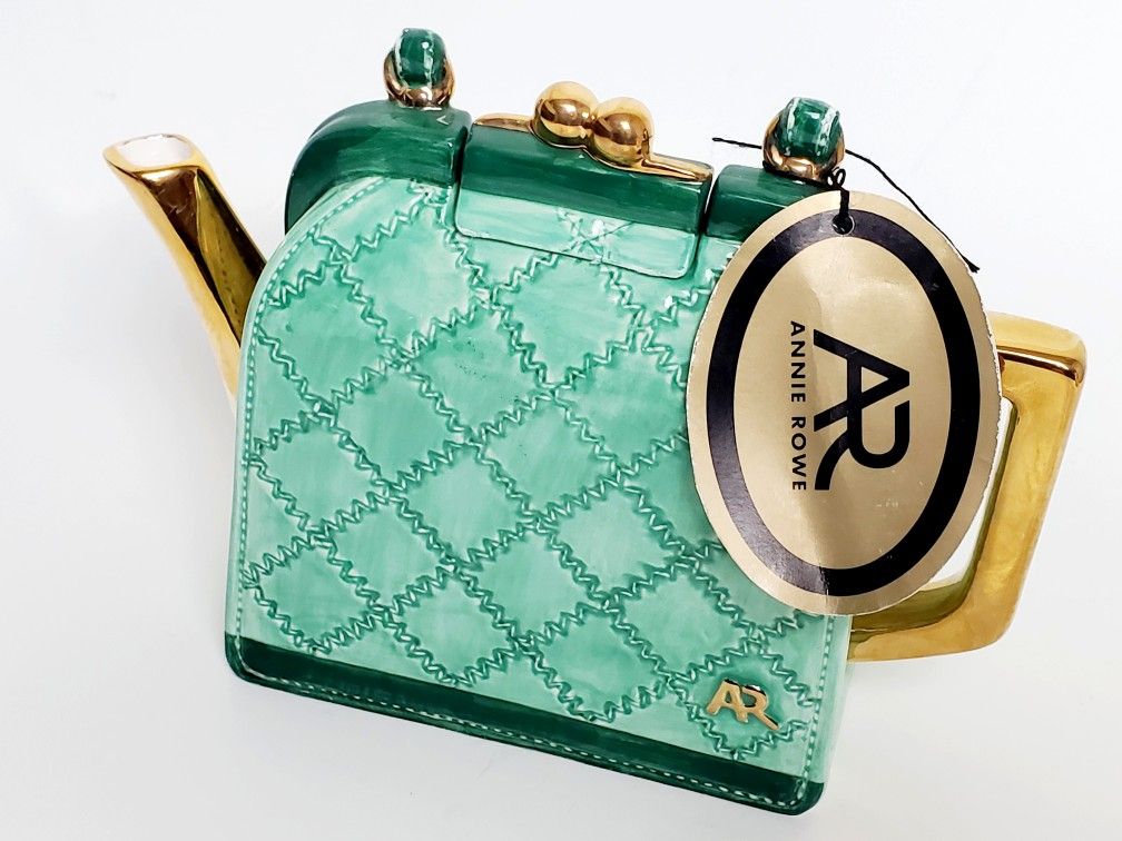 Annie Rowe The Village Purse Handbag Tea Pot Gold Trim Western House-Green/Gold Gorgeous little purse teapot by Western House. Lovely soft green color with gold trim and original tag. Never used. Excellent condition with no chips or cracks. Weight- 10.5 oz Measurements- 7 x 2.5 x 6 inches tall
