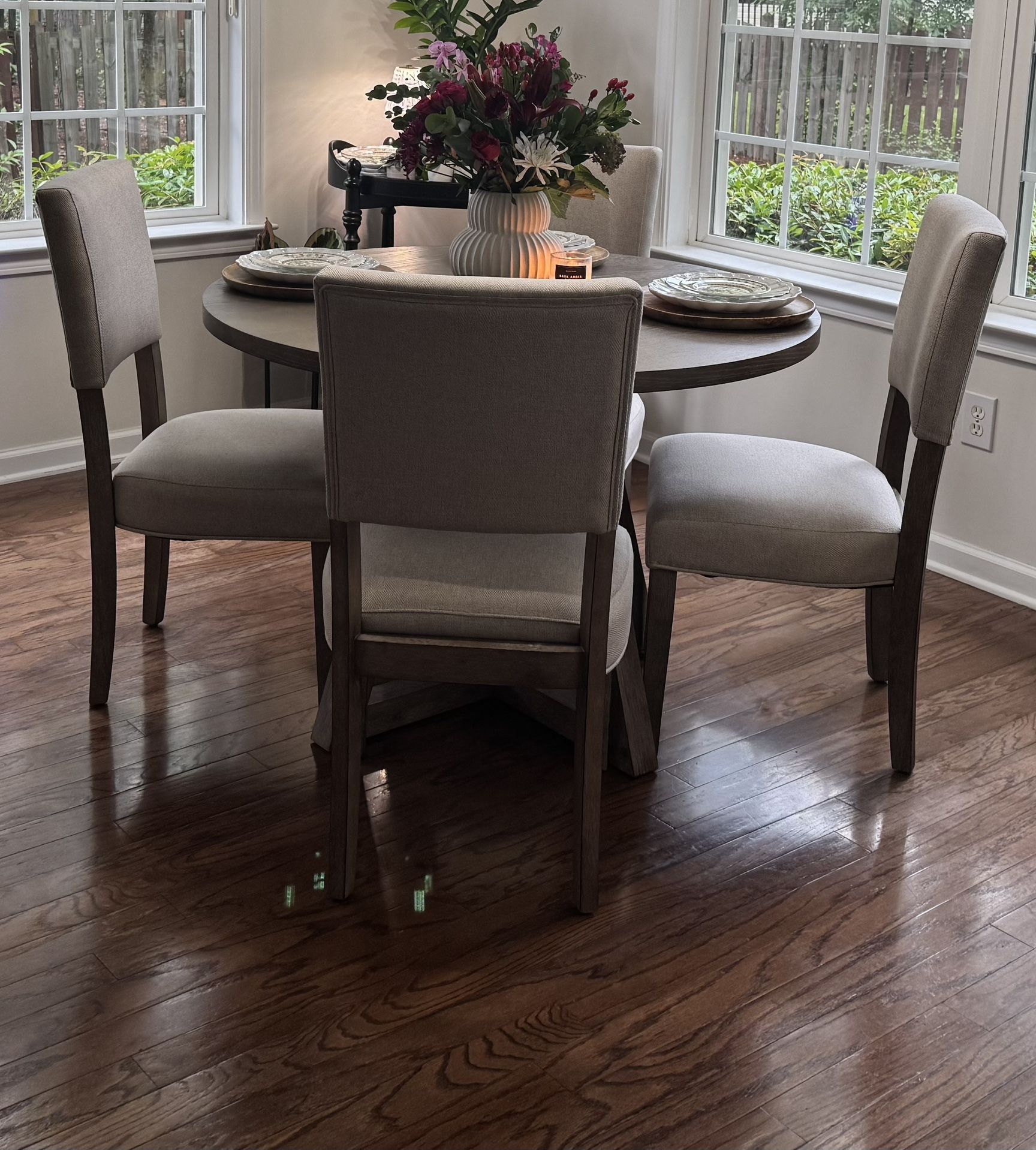 Set of 4 like new dining chairs. Cream/linen color. Brown white wash wood frame and legs. Table not included.